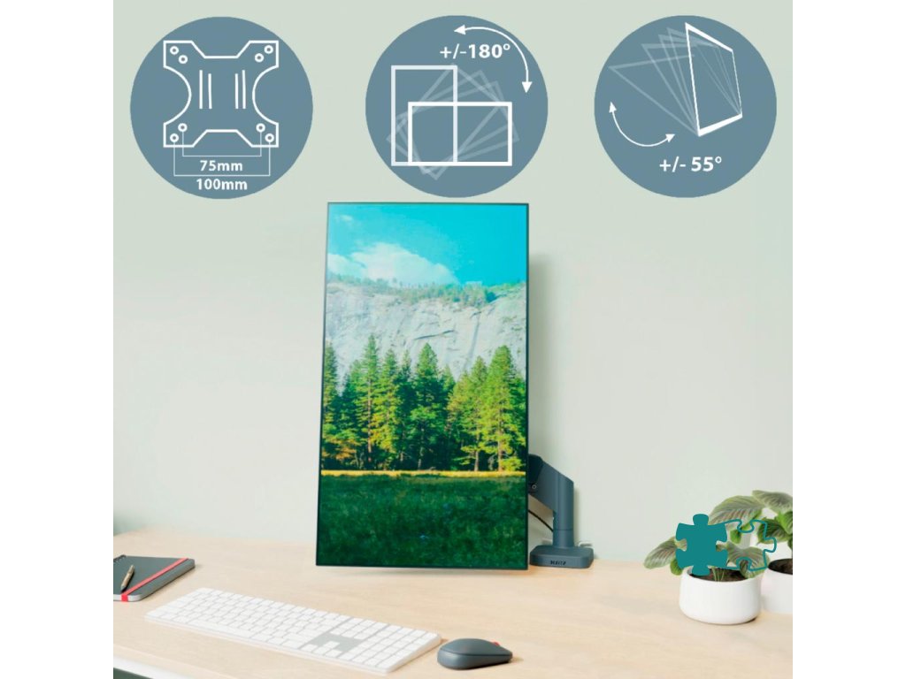 Jednoduché nastavenie výšky, hĺbky a sklonu jednou rukou: +/- 90° vľavo a vpravo otočenie, až 180° horizontálne a vertikálne otočenie monitora, +/- 55° naklonenie obrazovky.