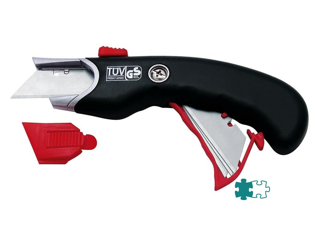 Rezač s pogumovanou rukoväťou a pevnou kovovou hlavicou. Nôž sa vysúva pomocou bežca, ktorý treba počas rezania držať, čo zvyšuje bezpečnosť rezania. Vhodný pre pravákov i ľavákov vďaka umiestneniu bežca v strede rezača. Integrovaný zásobník obsahuje 5 náhradných nožov. Šírka čepele 25 mm. Schválené inštitútom TÜV. Farba čierna/ červená.Šírka čepele: 25 mm