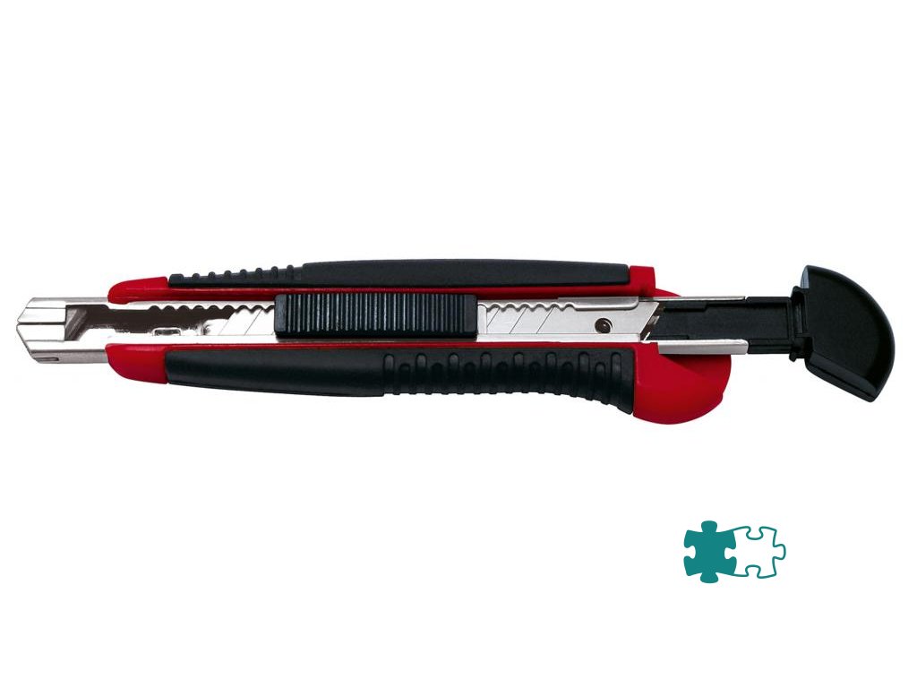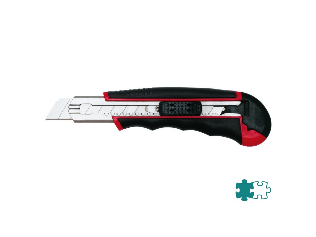 Robustný profesionálny rezač s gumeným vrúbkovaným úchytom, pevným celokovovým vedením noža a automatickým uzamknutím noža. Po vytiahnutí opotrebovaného noža sa zasunutím bežca nainštaluje z integrovaného zásobníka automaticky nôž nový. Šírka čepele 18 mm. V balení 6 náhradných čepiel. Schválené inštitútom TÜV. Farba čierna/ červená.Šírka čepele: 18 mm