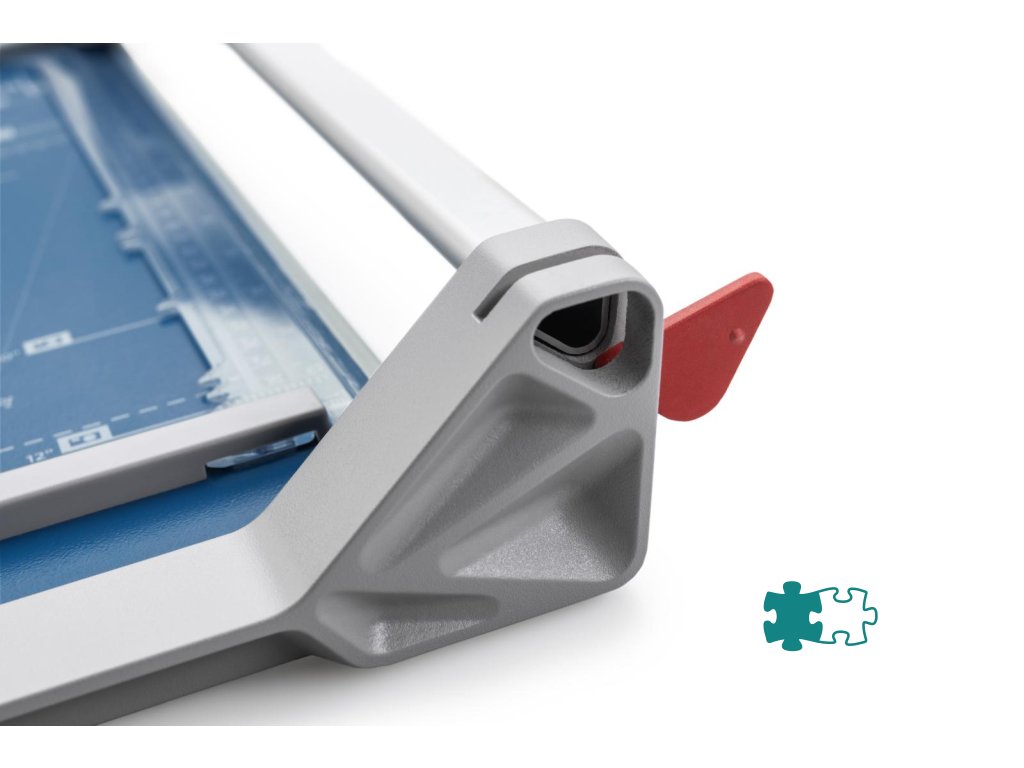 Rezačka s kruhovým nožom a kovovou základňou. Rotačný nôž v plastovom kryte, automatický prítlak, mierky v cm a DIN formátoch. Vhodná na rezanie papiera, etikiet, fotiek a filmov.Stabilná kovová základňa s protišmykovými gumenými nožičkami pre bezpečné udržanie rotačného vyžínača na mieste.