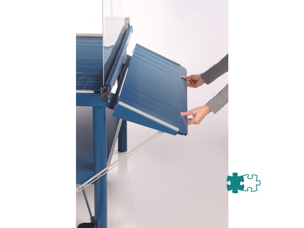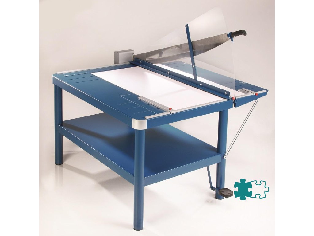 Veľká kovová robustná páková rezačka s vlastným stojanom a uzamykateľným nožom. Brúsený vrchný a spodný nôž z kvalitnej nožiarskej ocele Solingen, rozkladateľný bočný stôl, nožný pedál na zabezpečenie prítlaku rezaného papiera, priehľadný ochranný kryt ostria z plexiskla, 2 bočné dorazy, zadný doraz. Predný doraz, fixovateľný ručnou pákou, vysúvateľný do 275 mm. Mierka v cm/ inch, DIN formáty.K rezačke je možné objednať zariadenie na rezanie tenkých prúžkov a zariadenie umožňujúce vytvoriť laserový lúč, indikujúci reznú líniu.Dĺžka rezu: 1100 mm