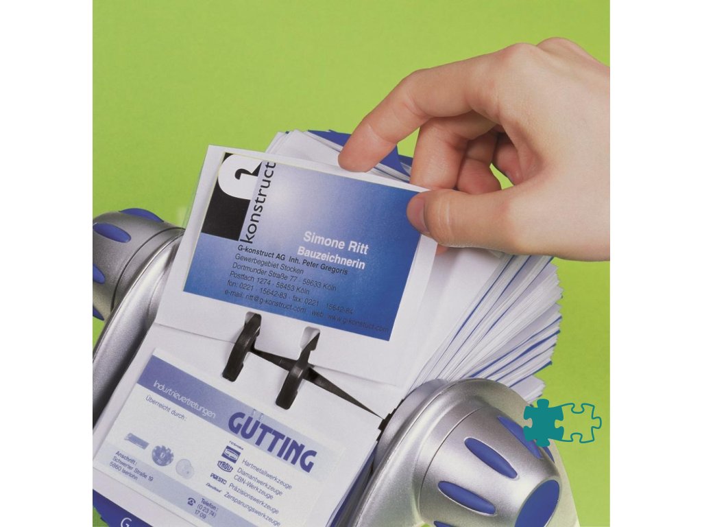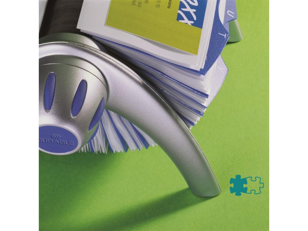 Rotačný vizitkár v exkluzívnom dizajne z plastu v kvalitnej povrchovej úprave. 200 obojstranných vreciek rozmeru 72 × 104 mm pre 400 vizitiek, abecedný rozraďovač s 25 oddielmi. Doplniteľný náhradnými vreckami Obj. kód DU241819.Farba: strieborná/modrá