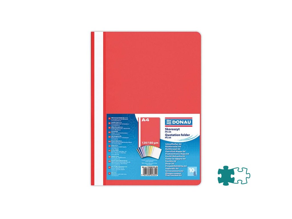 Štandardný polypropylénový rýchloviazač s priehľadnou prednou stranou a nasúvacím popisným pásikom. Formát A4. Balenie 10 ks.Farba: červená