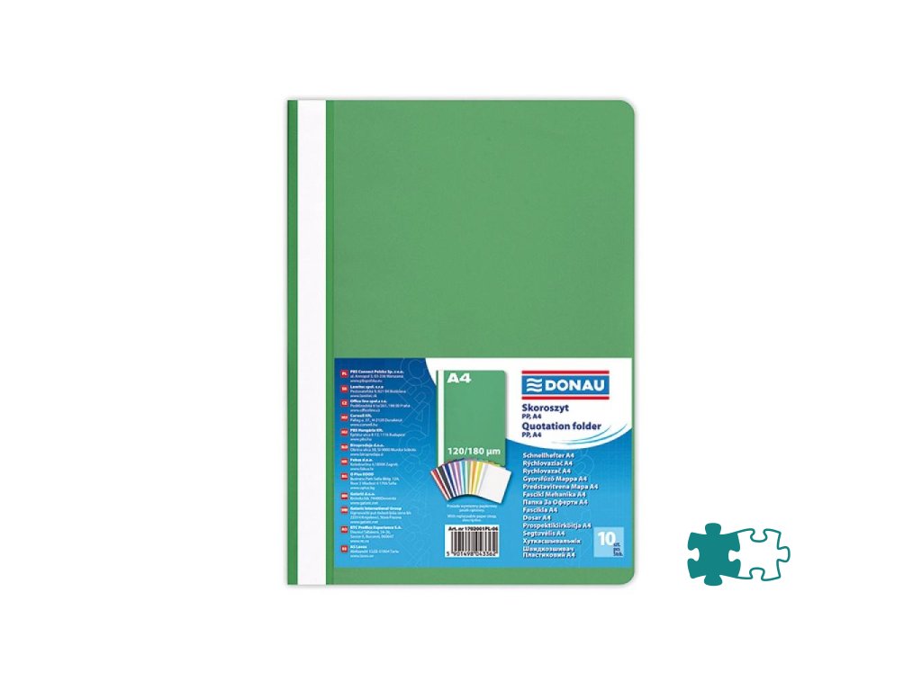 Štandardný polypropylénový rýchloviazač s priehľadnou prednou stranou a nasúvacím popisným pásikom. Formát A4. Balenie 10 ks.Farba: zelená