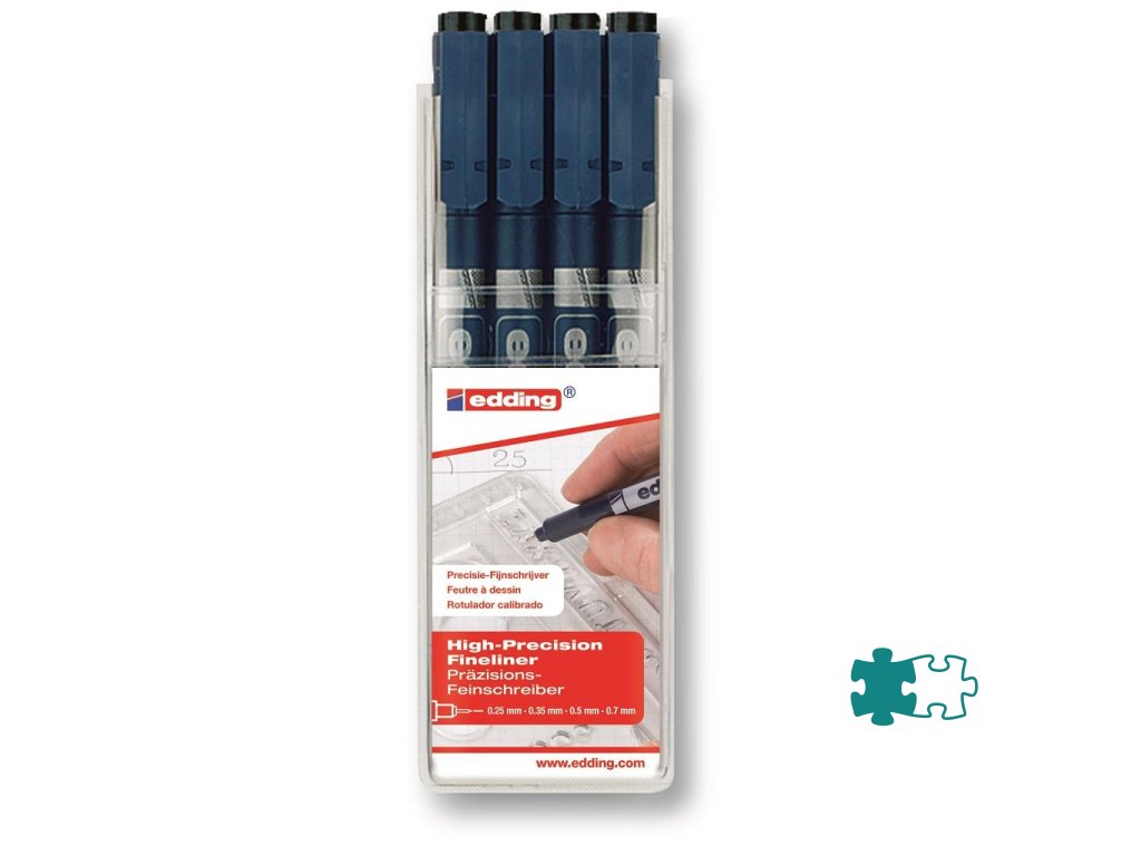 Jednorazový liner s vláknovým hrotom v kovovej objímke so svetlostálym, vode odolným pigmentovým atramentom. Ideálny na náčrty, technické kreslenie a prácu so šablónami. Farba čierna. Sada 4 kusov. Šírky : 0,1 mm, 0,3 mm, 0,5 mm. 0,7 mm.Dodatočné parametre