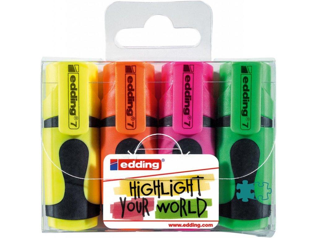 4 kusová sada mini zvýrazňovačov edding so zrezaným hrotom so šírkou stopy 1 - 3 mm. Neónový pigment s maximálnym jasom, protišmyková ergonomická rukoväť. Uzáver s klipom. Väčšie balenie 10 ks v jednej farbe. Balenie sada 4 kusov.Dodatočné parametre