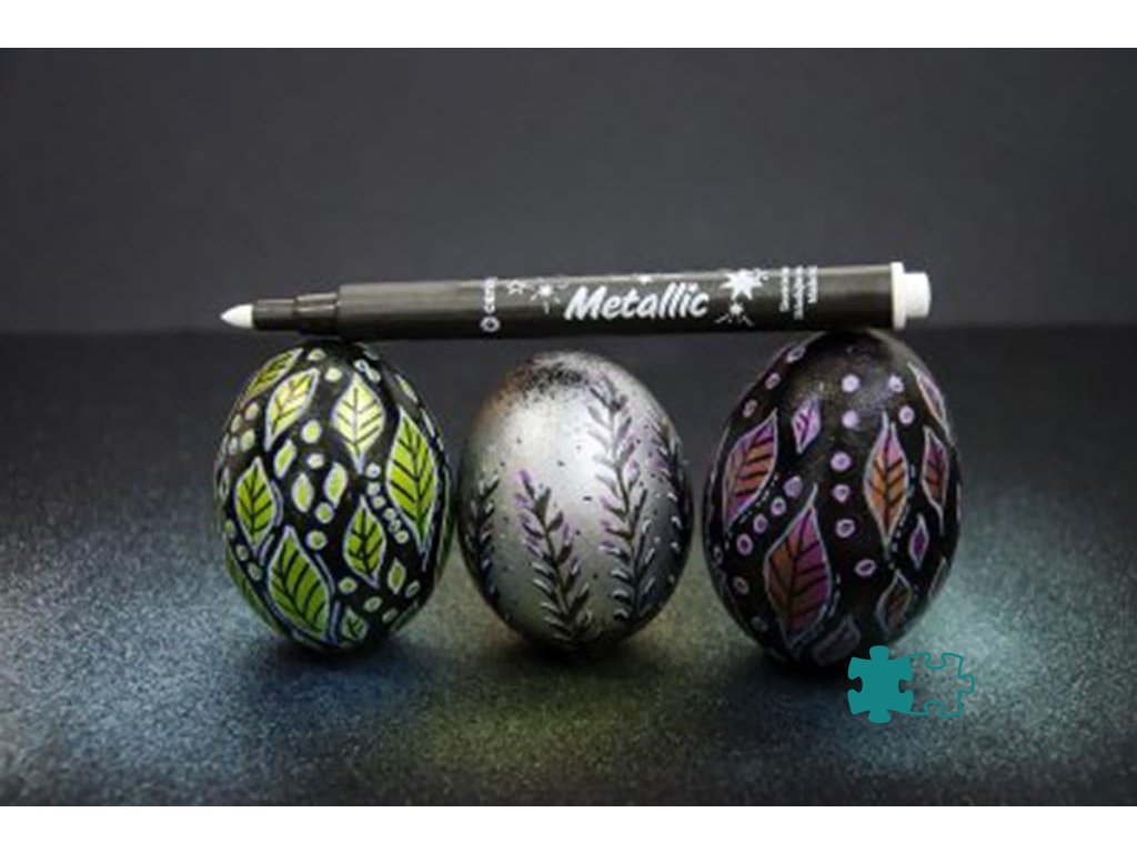 Sada 8 metalických odtieňov a 1 biely popisovač určený k dekorácii rôznych materiálov (lakový papier, kov, sklo, fólia, keramika, kraslica, kameň). Svetlostály pigmentový atrament na vodnej báze. Stopa písma je výrazne sýta, permanentná, svetlostála. Po dokonalom zaschnutí (min. 4 hod.) sa stopa stáva odolnou voči oteru a na poréznych povrchoch i vode. Z neporéznych materiálov možno zmyť vodou so saponátmi. Šírka stopy 1,5 mm. Skladujte vo vodorovnej polohe.Dodatočné parametre