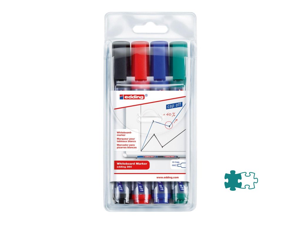 Popisovač vhodný na biele tabule, stierateľný za sucha. Plnený pigmentovým atramentom slabého zápachu bez prísady butylacetátu s vlastnosťou „Cap off“, zabraňujúcou vysychaniu atramentu pri otvorenom hrote aj niekoľko dní. Dopĺňateľný atramentom edding BTK 25. Plastové telo, vymeniteľný hrot. Hrot okrúhly, šírka stopy 1,5---3 mm. Sada 4 ks v mixe farieb.Farba: sada 4 farieb