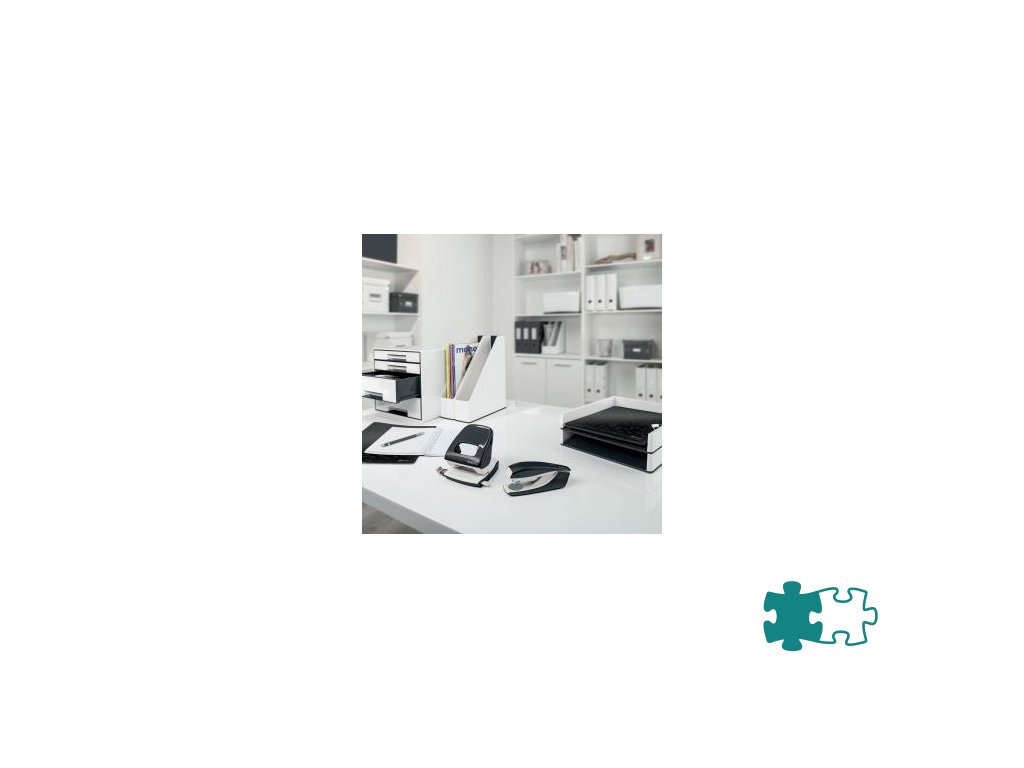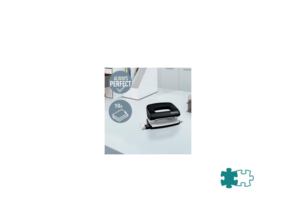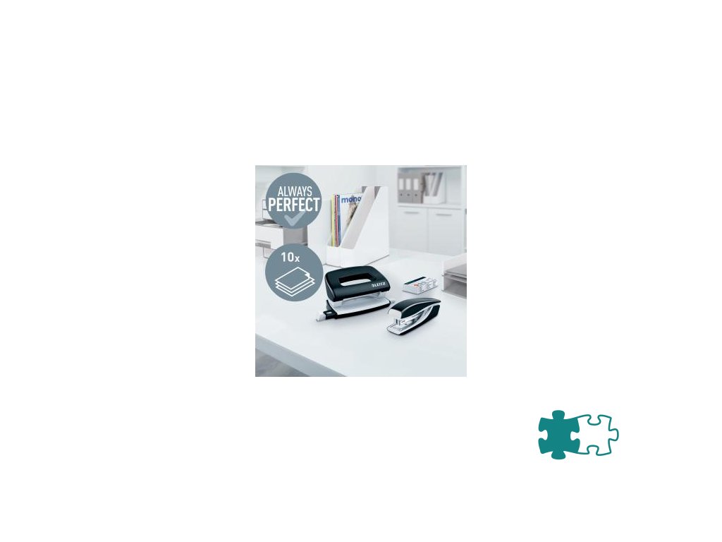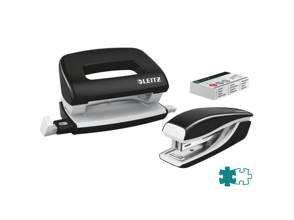 Minisúprava v moderných farbách. Malé a kompaktné rozmery. Kapacita 10 hárkov. Celokovová minizošívačka a dierovačka na použitie v kancelárii aj na cestách. Zošívačka s otvorením ramena o 180° na nástenkové zošívanie. Použite spinky Leitz Power Performance P2, č. 10, jedna škatuľka spiniek je súčasťou balenia. Dierovačka má príložník s kontrastnou potlačou jednotlivých formátov, rámček na jasné určenie formátu. Balenie v blistri. Farba čierna.Dodatočné parametre