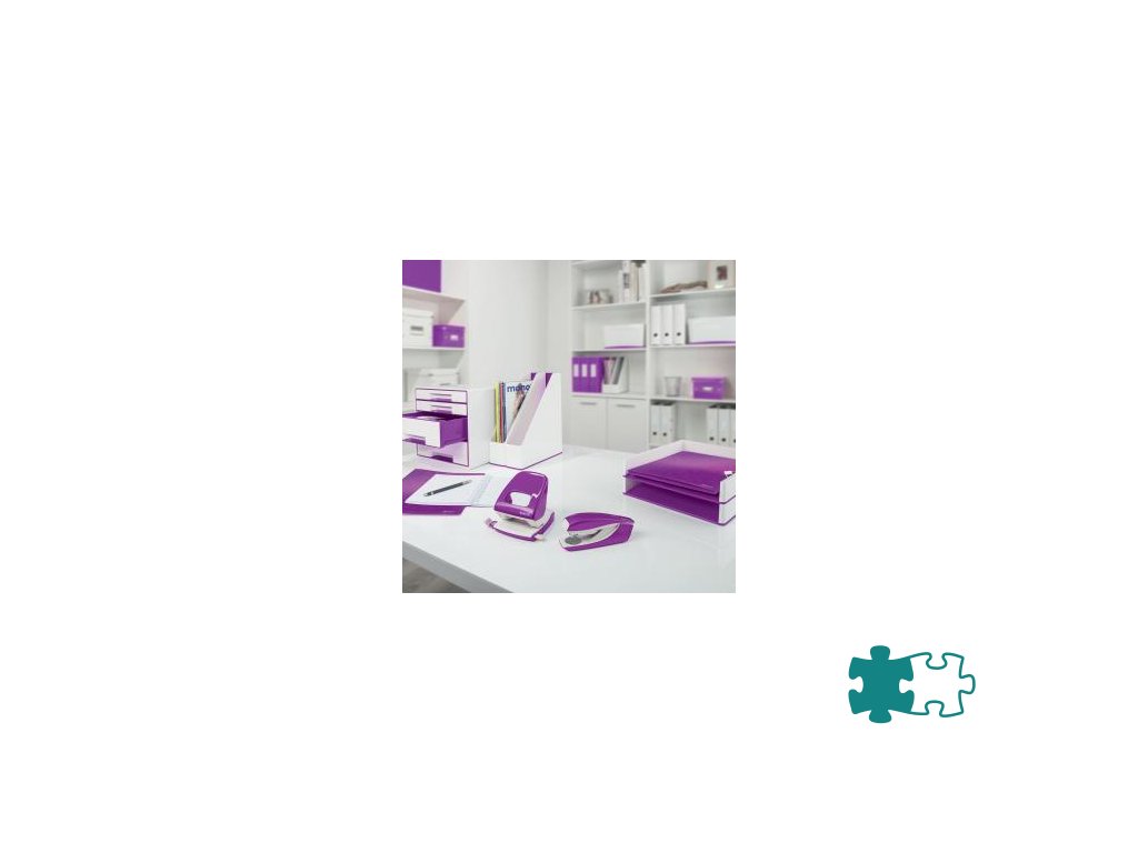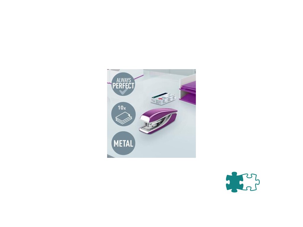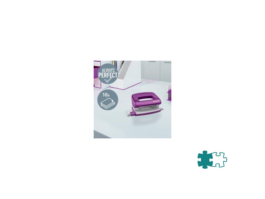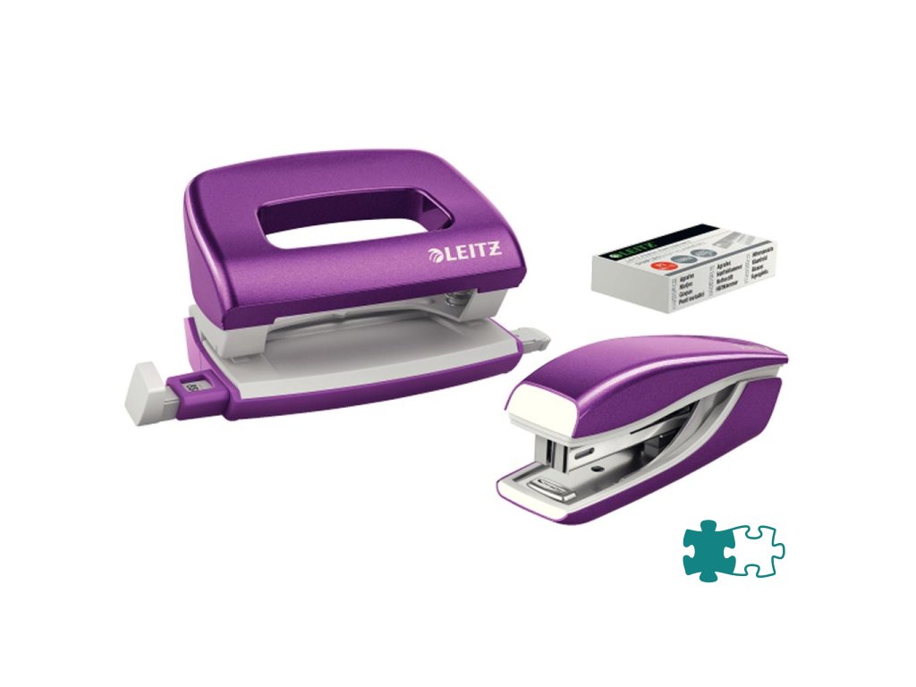 Minisúprava v moderných farbách. Malé a kompaktné rozmery. Kapacita 10 hárkov. Celokovová minizošívačka a dierovačka na použitie v kancelárii aj na cestách. Zošívačka s otvorením ramena o 180° na nástenkové zošívanie. Použite spinky Leitz Power Performance P2, č. 10, jedna škatuľka spiniek je súčasťou balenia. Dierovačka má príložník s kontrastnou potlačou jednotlivých formátov, rámček na jasné určenie formátu. Balenie v blistri. Farba purpurová.Dodatočné parametre