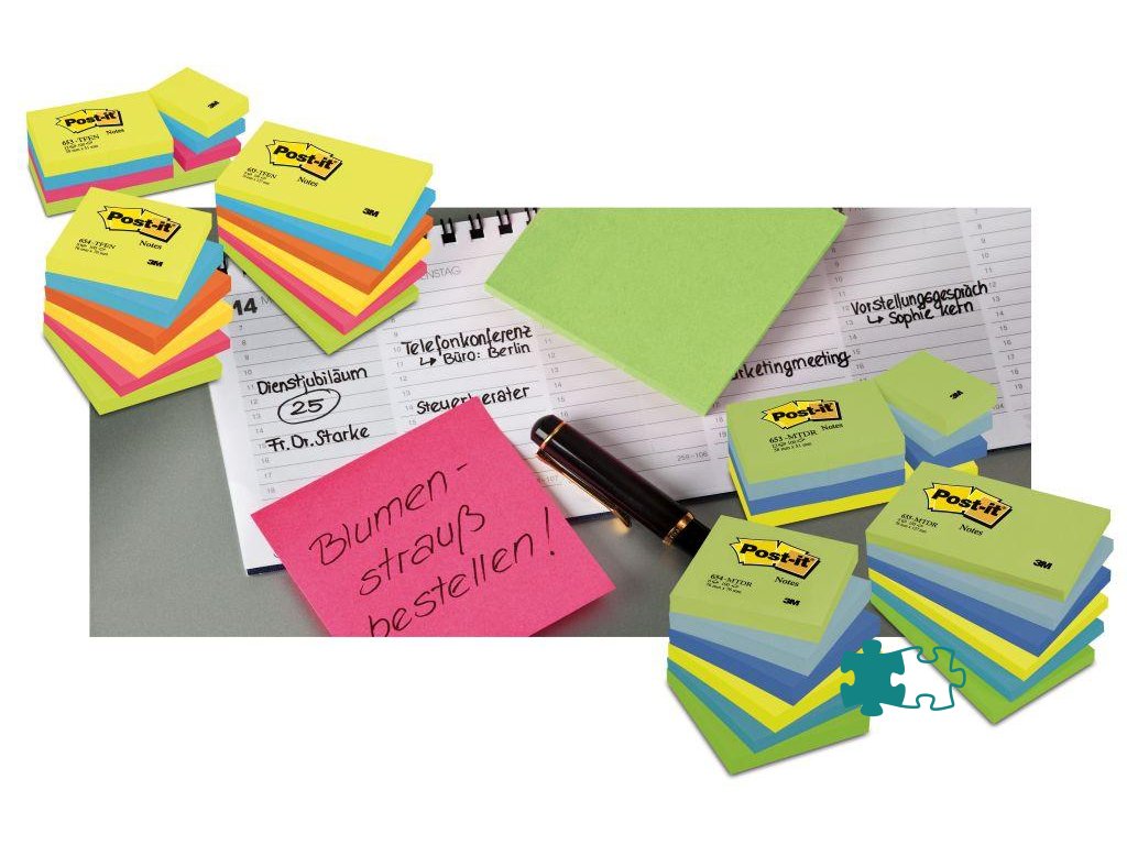Bločky bezo zvyšku odlepiteľné, odolné voči starnutiu. Farebný mix vo farbách ovocia. Jednotlivo balené. Rozmery 76 x 127 mm.- Post-it® farebné bločky pomáhajú zvýrazniť odkazy. Ideálne sa hodia na zorganizovanie informácií.