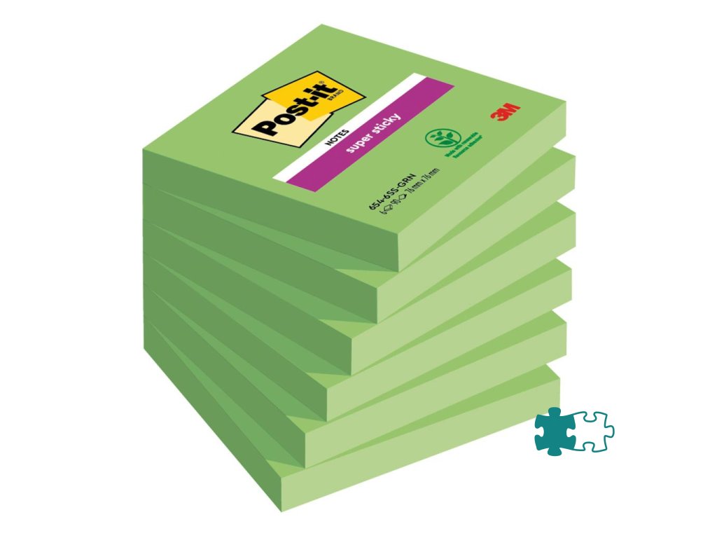 Bločky Post‑it® Super Sticky™ so špeciálnym lepidlom, vďaka ktorému držia aj na nerovnom povrchu. Po odlepení nezanechávajú stopy po lepidle. Farba svetlozelená. Rozmery 76 x76 mm. Počet lístkov 6 x 90.- Post-it® silne lepiace bločky majú v porovnaní s originálnymi Post-it® bločkami 2 x vyššiu priľnavosť. Sú veľmi pevné, mimoriadne univerzálne.