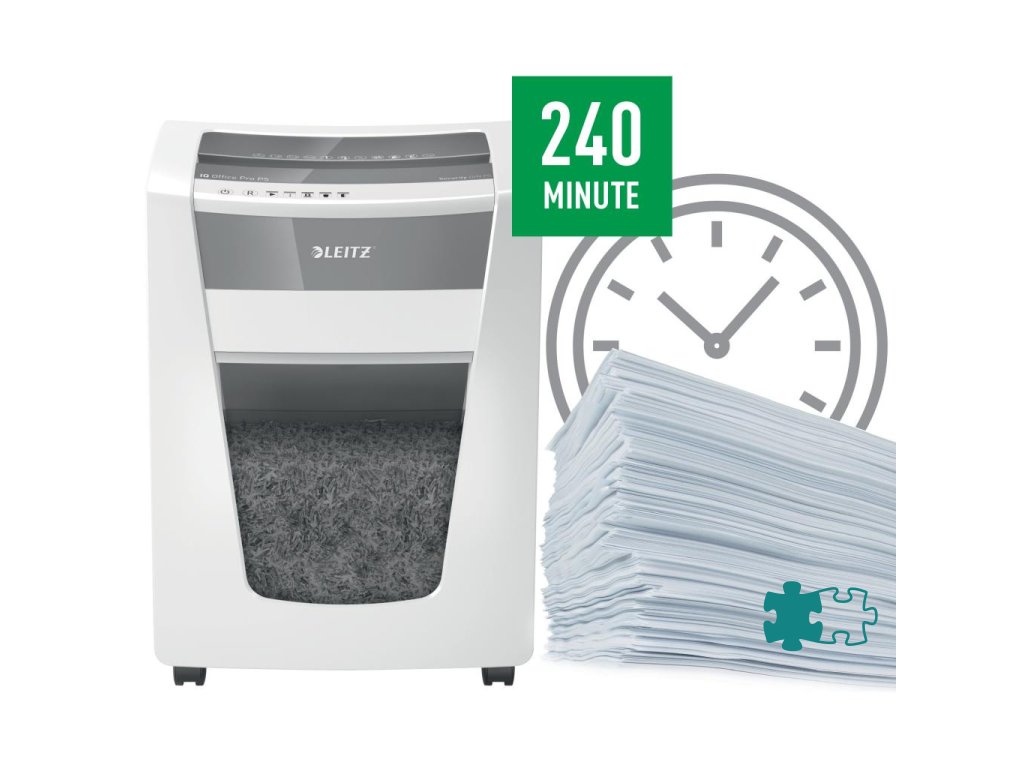 Nový skartovač Leitz IQ Office Pro ponúka moderný štýlový vzhľad, vysokú výkonnosť a bezpečnosť. Stupeň utajenia DIN P5 pre vysoké zabezpečenie skartovaných dokumentov. Perfektné bezproblémové skartovanie, ideálne na použitie vo veľkých kanceláriách. Excelentný výkon s technológiou proti zaseknutiu papiera, tichý chod a dlhý čas, po ktorý je skartovač schopný skartovať. Skartuje až 15 hárkov A4 na malé mikročasti a do veľkého koša s objemom 30 l. Jednoduché ovládanie pomocou dotykových ovládacích prvkov. Dlhý skartovací cyklus pre až 4 hodiny dlhé neprerušované skartovanie.
