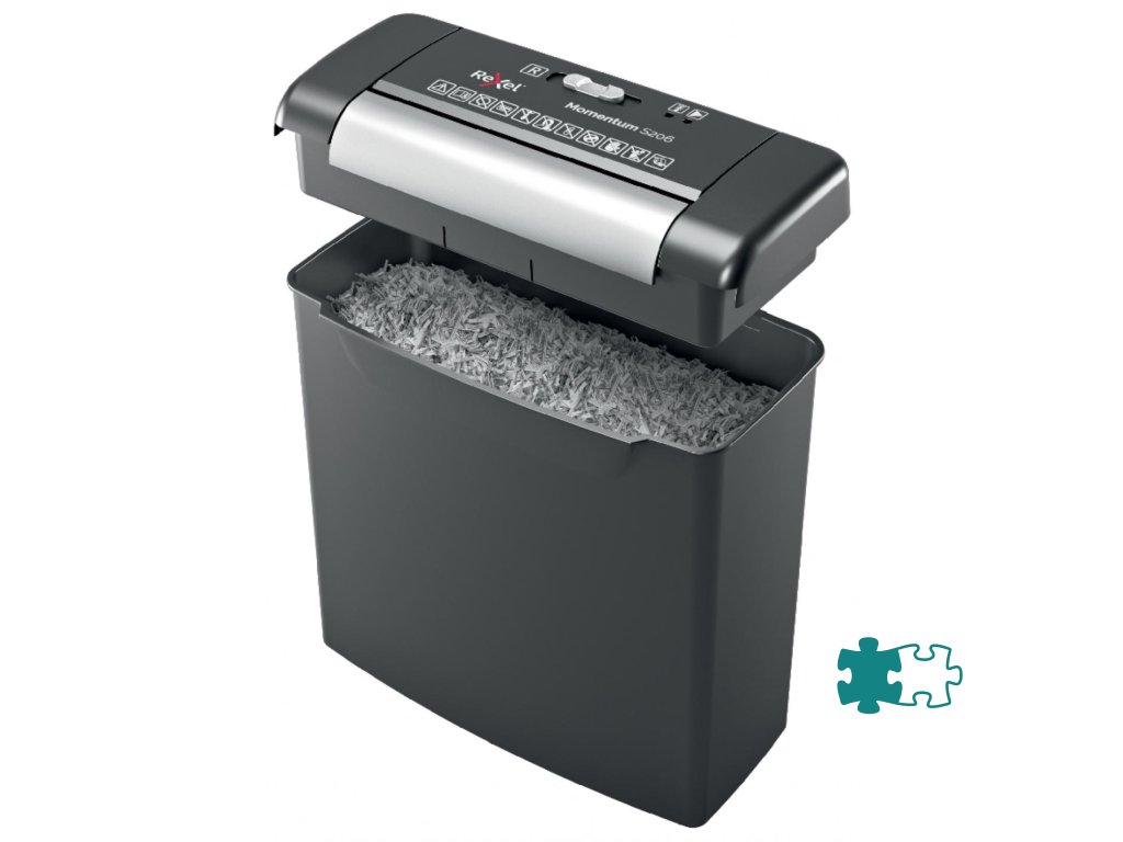 Nezastaviteľná skartovačka! Rexel Momentum S206 skartuje až 6 hárkov naraz a vydrží v nepretržitom chode 2 minúty, vhodná na použitie doma. Prúžkový rez na úrovni zabezpečenia P2 reže papier na prúžky so šírkou 6 mm. Odpadový kôš s kapacitou 9 l pojme 75 hárkov A4.