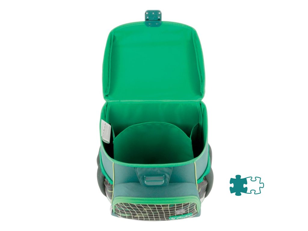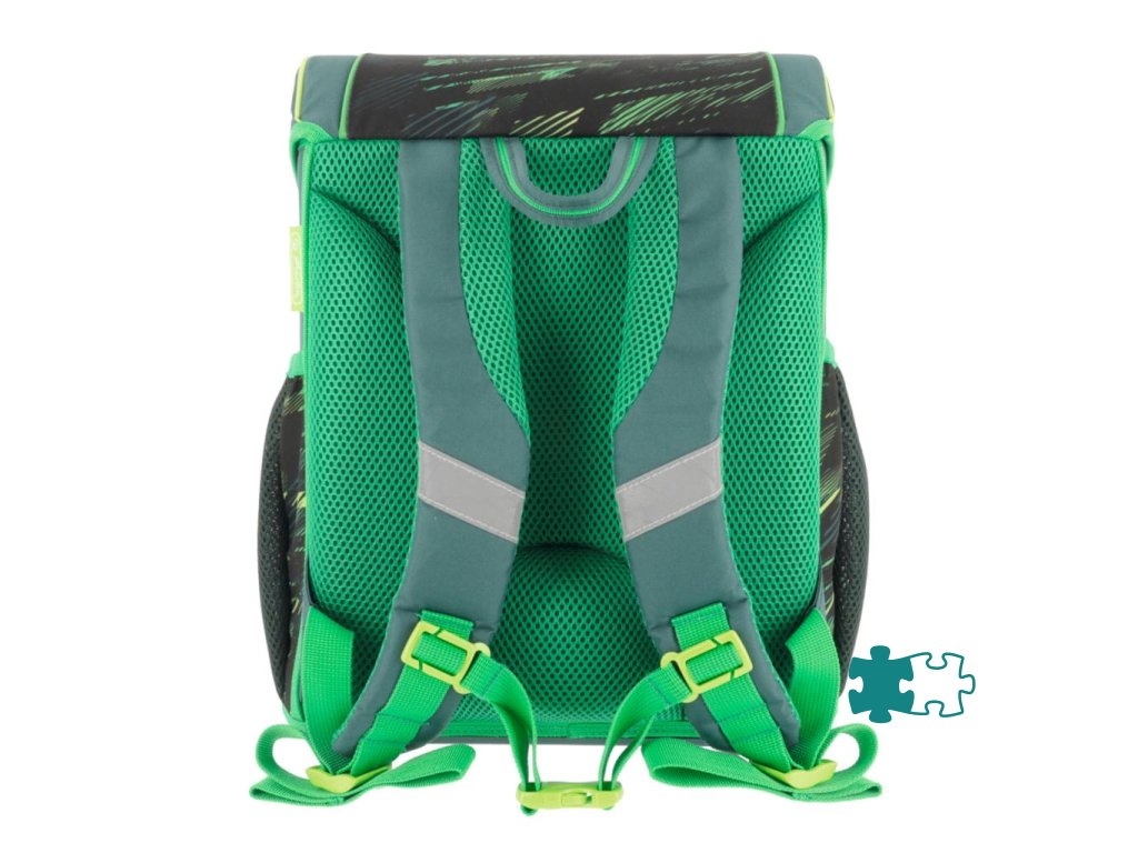 Školská taška s výbavou, ergonomicky tvarovaným a priedušným polstrovaním chrbta, nastaviteľnými ramennými popruhmi, výškovo nastaviteľným hrudným pásom, hlavným vreckom s priestorom na knihy, bočnými vreckami s elastickými pásikmi, predným vreckom na zips, stabilnou spodnou doskou s nožičkami, pohodlnou rukoväťou a reflexnými prvkami Oralite. Hmotnosť 950 g, objem 16 l, rozmery 37 x 31 x 22 cm. Vode-odolná, bez PVC, výbava: peračník, vrecko na prezuvky, okrúhle puzdro. Certifikát ergonómie 2023 a 2025. Materiál: Polyester.Dodatočné parametre