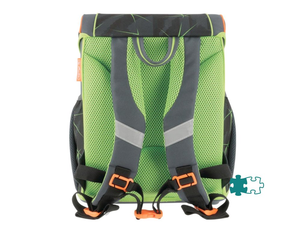 Školská taška s výbavou, ergonomicky tvarovaným a priedušným polstrovaním chrbta, nastaviteľnými ramennými popruhmi, výškovo nastaviteľným hrudným pásom, hlavným vreckom s priestorom na knihy, bočnými vreckami s elastickými pásikmi, predným vreckom na zips, stabilnou spodnou doskou s nožičkami, pohodlnou rukoväťou a reflexnými prvkami Oralite. Hmotnosť 950 g, objem 16 l, rozmery 37 x 31 x 22 cm. Vode-odolná, bez PVC, výbava: peračník, vrecko na prezuvky, okrúhle puzdro. Certifikát ergonómie 2023 a 2025. Materiál: polyester.Dodatočné parametre