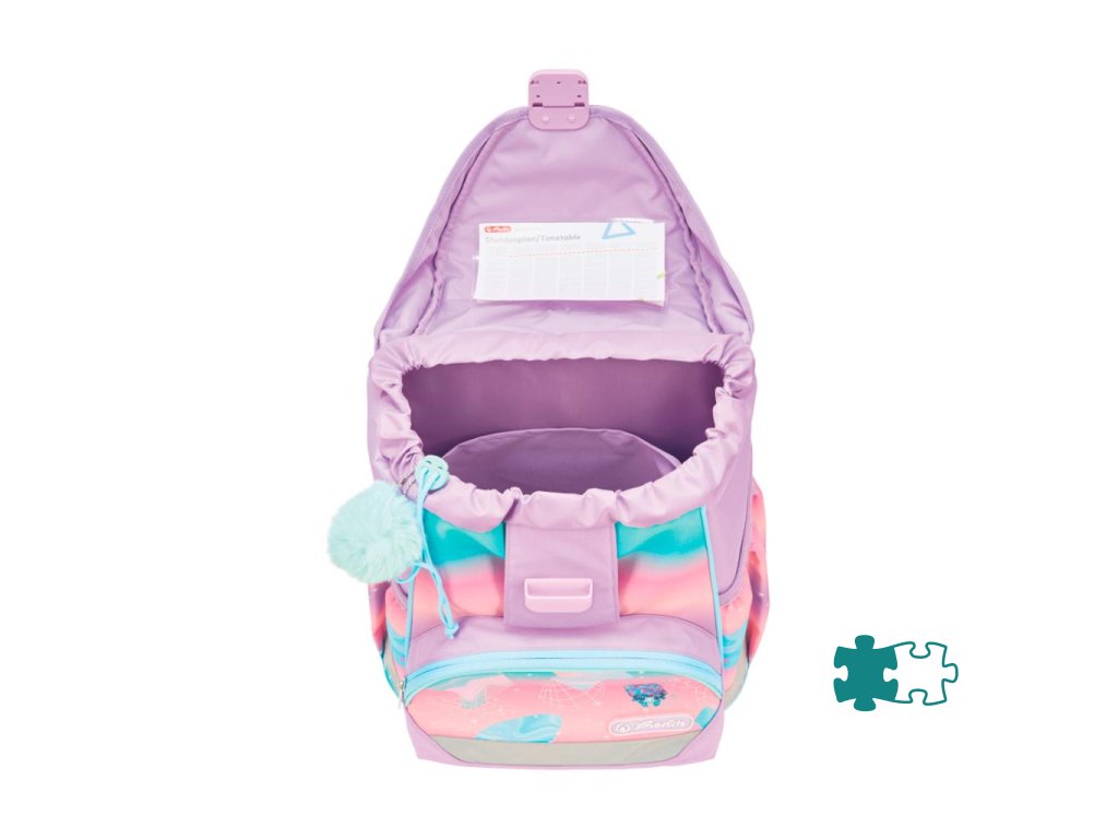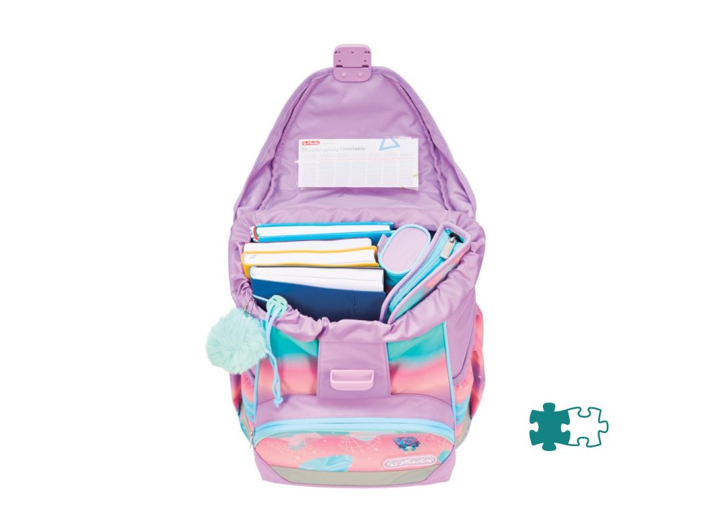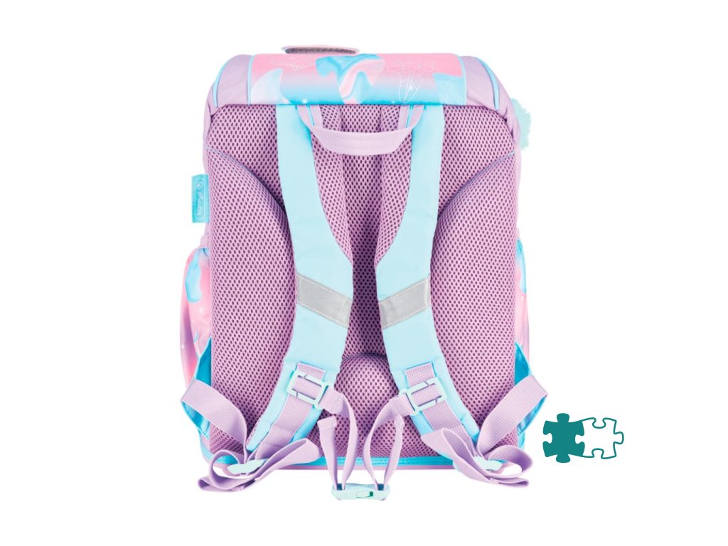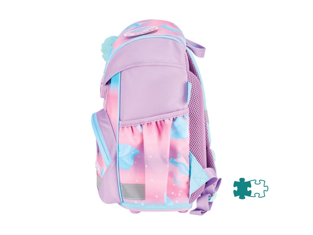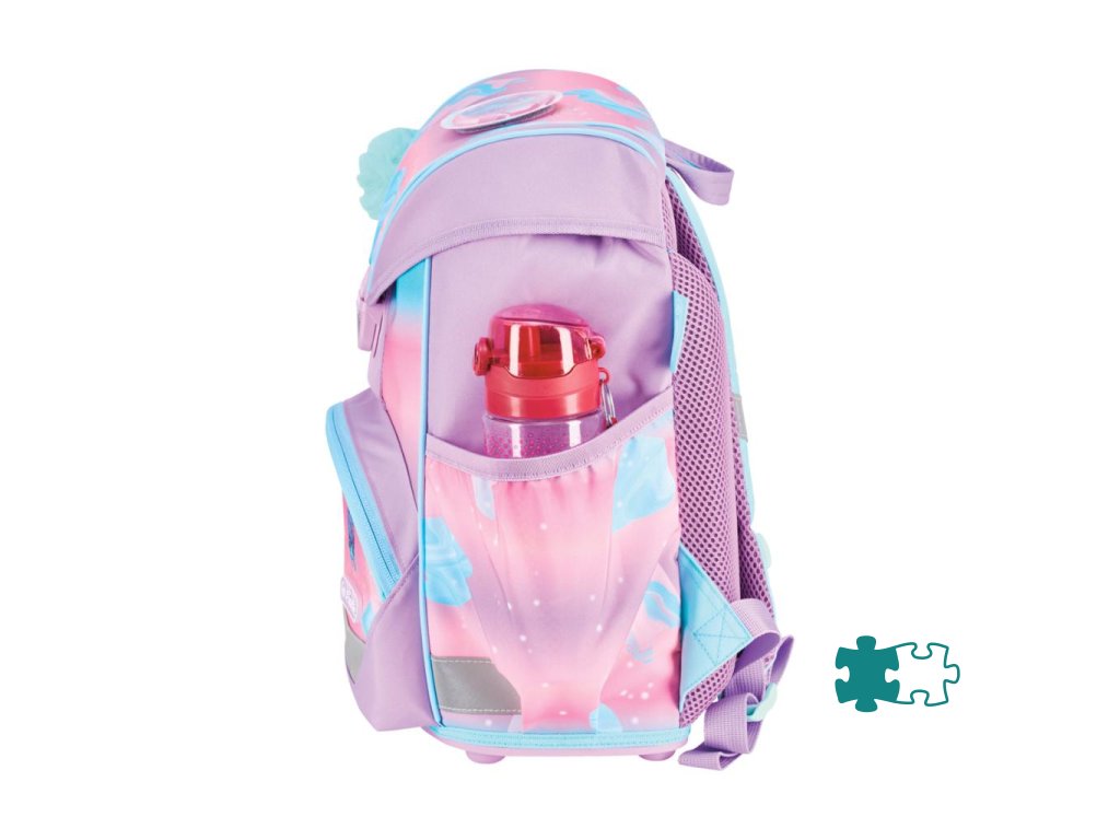 Školská taška bez výbavy, s anatomicky tvarovaným polstrovaným chrbtom, širokými nastaviteľnými ramennými popruhmi, hrudným popruhom, predným vreckom, dvomi bočnými vreckami, reflexnými prvkami Oralite, 1x aplikácia na suchý zips, 1 x dekoratívny prvok. Hmotnosť 750 g, objem 15 l, rozmery: 36 x 28 x 21 cm.Dodatočné parametre