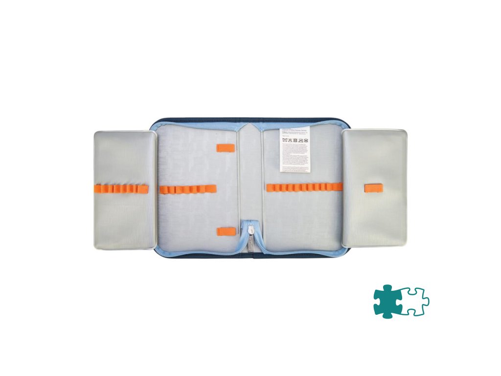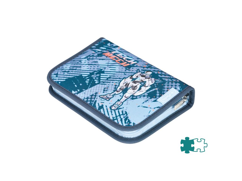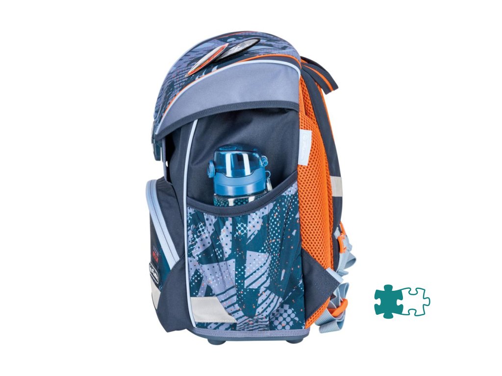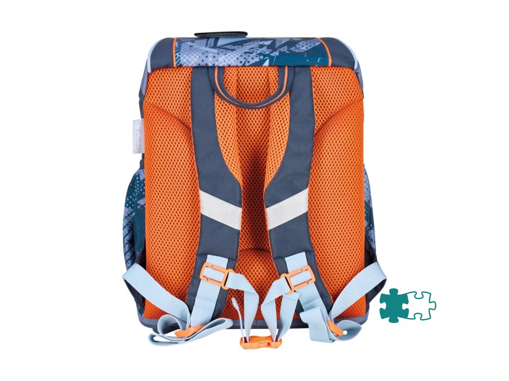 Školská taška s výbavou, s anatomicky tvarovaným polstrovaným a priedušným chrbtom, nastaviteľnými ramennými popruhmi, predným vreckom na zips, dvomi bočnými vreckami s elastickými pásikmi, stabilnou spodná doskou s nožičkami, pohodlnou rukoväťou, reflexnými prvkami Oralite, zatváranie Click lock zips, 1 x odnímateľný odznačik na suchý zips, 1 x dekoratívny prvok. Hmotnosť 800 g, objem 22 l, rozmery: 39 x 32 x 25 cm. Vode-odolná, bez PVC, výbava: peračník prázdny 2 chlopne, vrecko na prezuvky, oválne puzdro.Dodatočné parametre