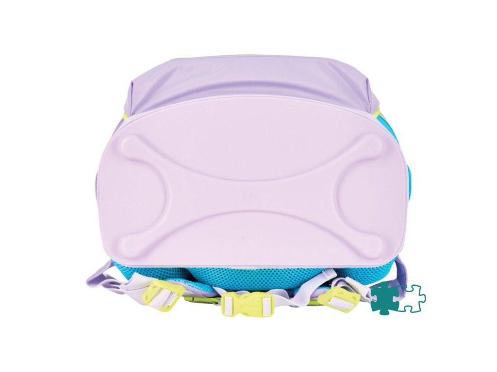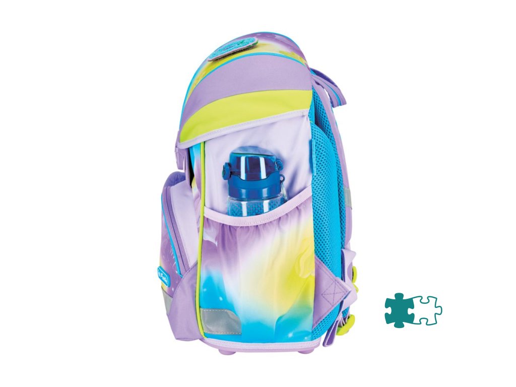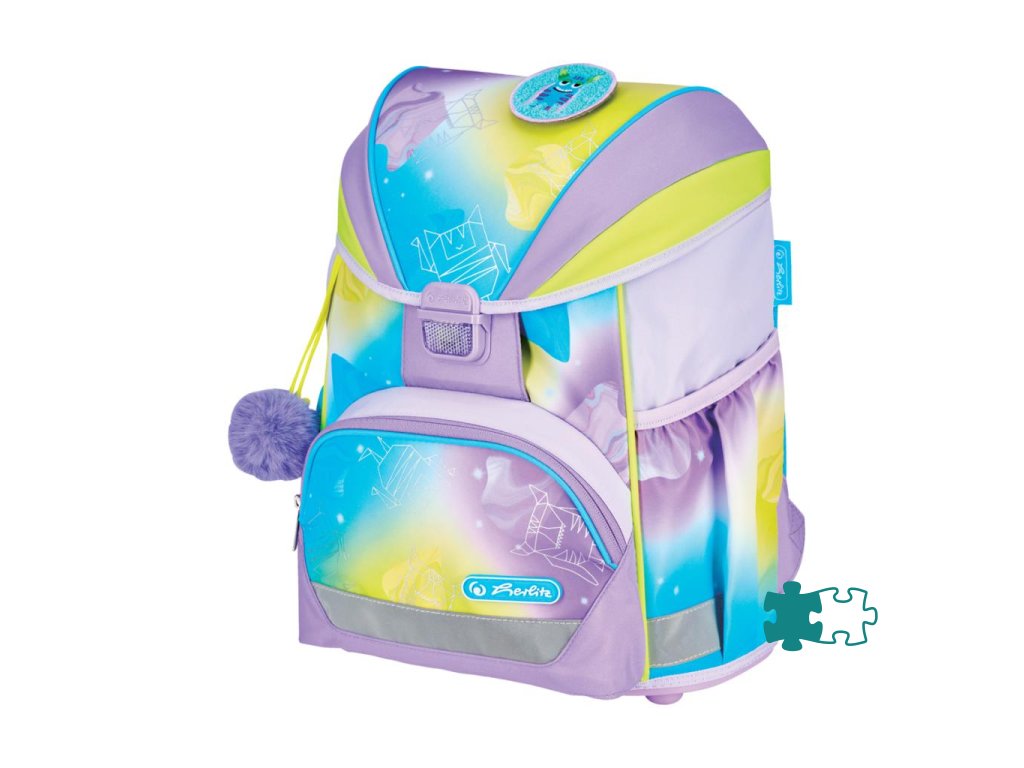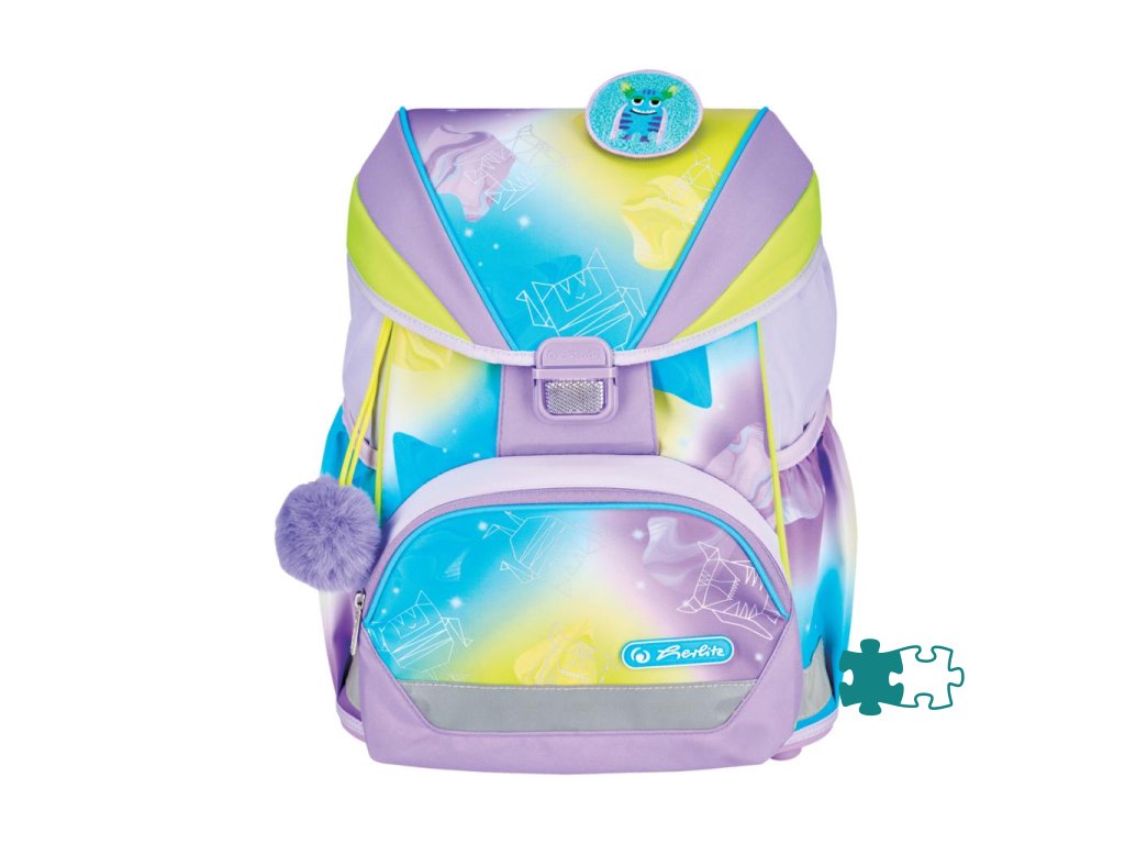 Školská taška s výbavou, s anatomicky tvarovaným polstrovaným a priedušným chrbtom, nastaviteľnými ramennými popruhmi, predným vreckom na zips, dvomi bočnými vreckami s elastickými pásikmi, stabilnou spodná doskou s nožičkami, pohodlnou rukoväťou, reflexnými prvkami Oralite, zatváranie Click lock zips, 1 x odnímateľný odznačik na suchý zips, 1 x dekoratívny prvok. Hmotnosť 800 g, objem 22 l, rozmery: 39 x 32 x 25 cm. Vode-odolná, bez PVC, výbava: peračník prázdny 2 chlopne, vrecko na prezuvky, oválne puzdro.Dodatočné parametre