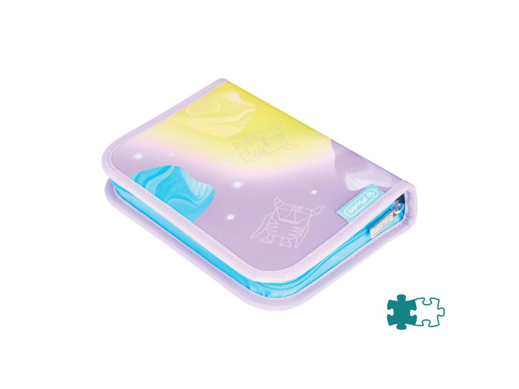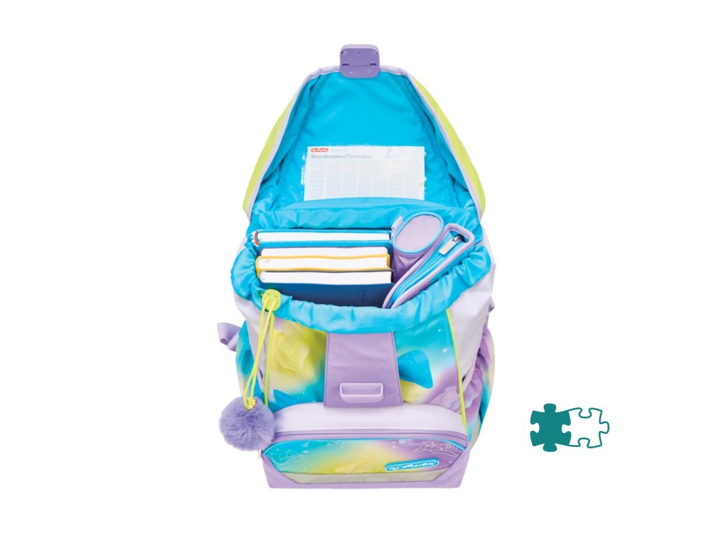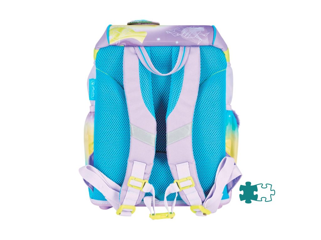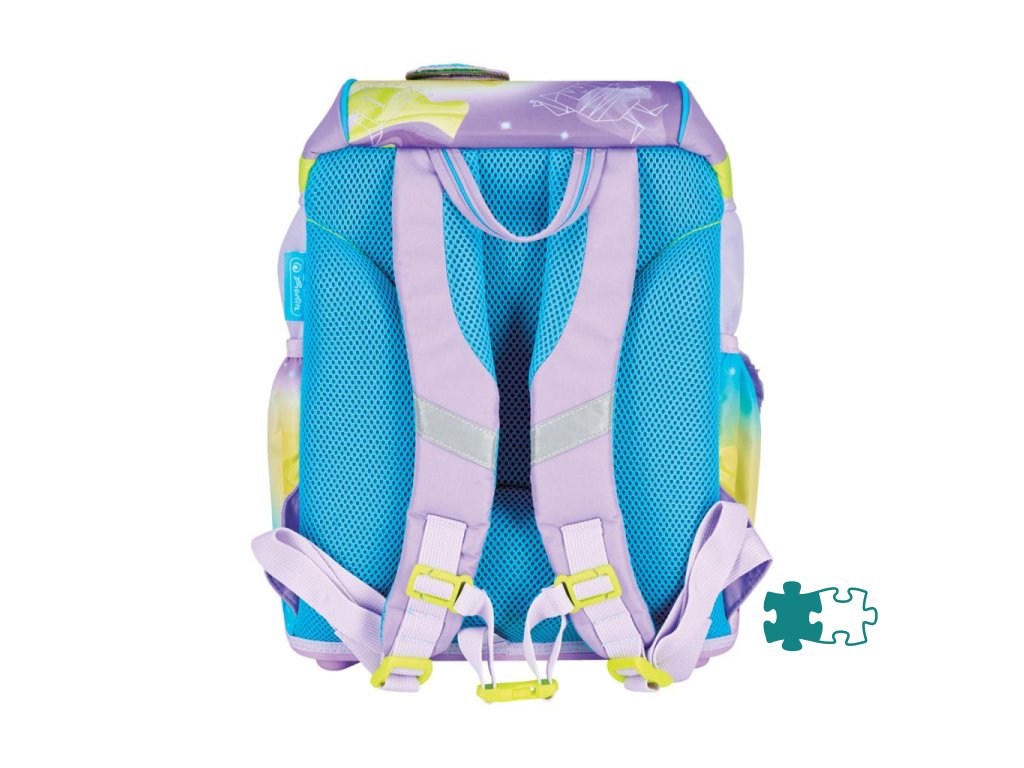 Školská taška s výbavou, s anatomicky tvarovaným polstrovaným a priedušným chrbtom, nastaviteľnými ramennými popruhmi, predným vreckom na zips, dvomi bočnými vreckami s elastickými pásikmi, stabilnou spodná doskou s nožičkami, pohodlnou rukoväťou, reflexnými prvkami Oralite, zatváranie Click lock zips, 1 x odnímateľný odznačik na suchý zips, 1 x dekoratívny prvok. Hmotnosť 800 g, objem 22 l, rozmery: 39 x 32 x 25 cm. Vode-odolná, bez PVC, výbava: peračník prázdny 2 chlopne, vrecko na prezuvky, oválne puzdro.Dodatočné parametre
