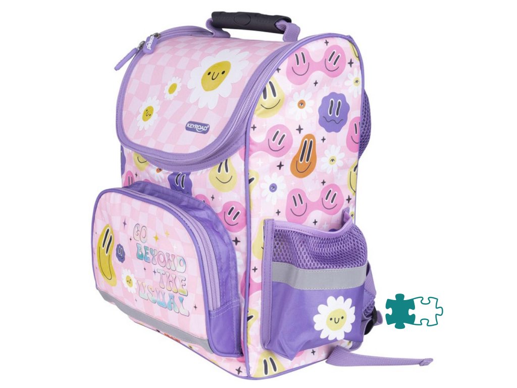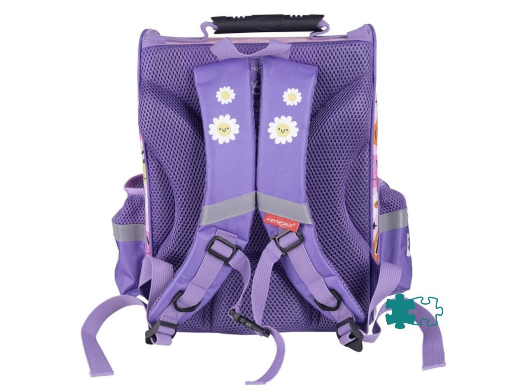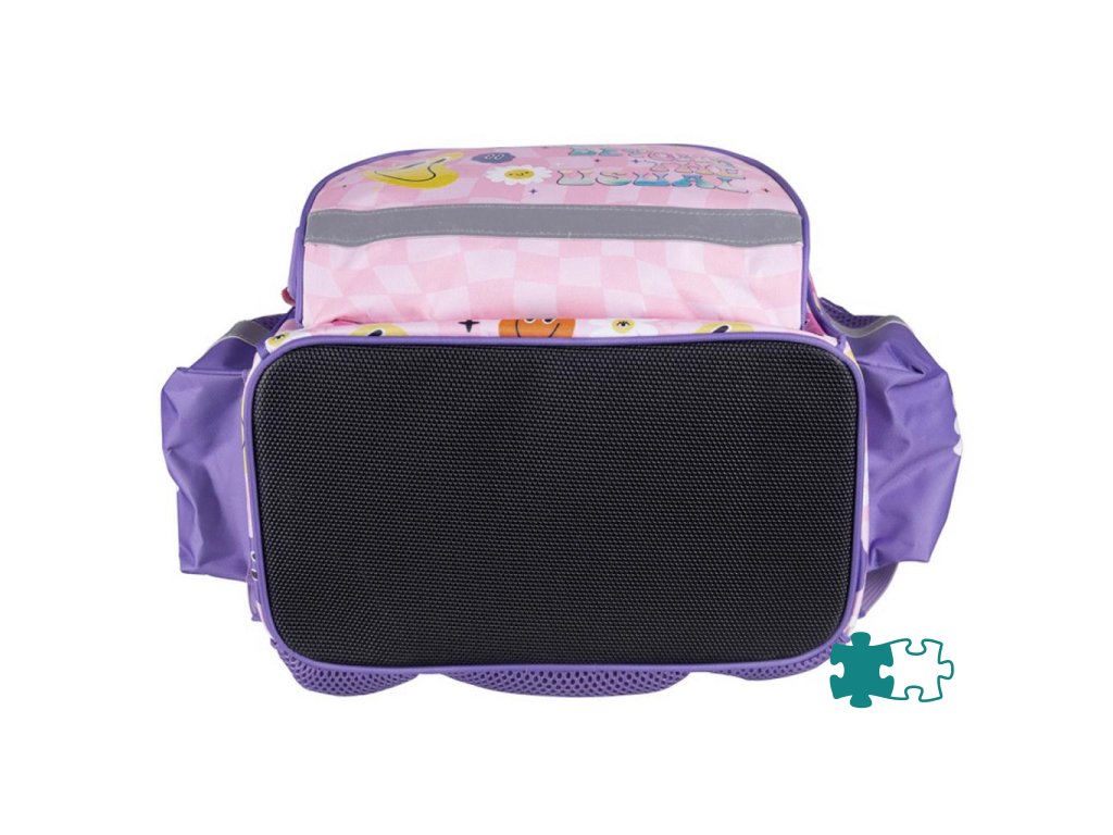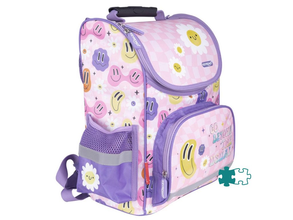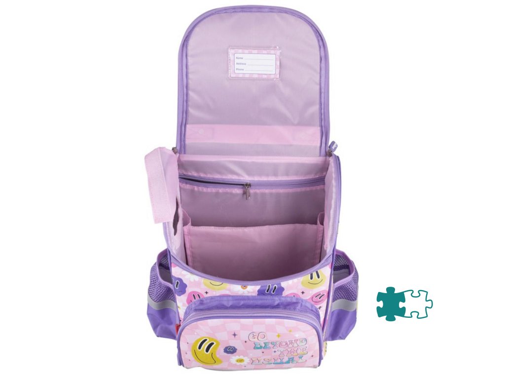 Extrémne ľahká školská taška prispôsobená veku a hmotnosti dieťaťa, čo znamená, že dodatočne nezaťažuje chrbticu a kĺby. Vhodná pre žiakov 1. - 2. ročníka ZŠ. Profilovaná a vystužená konštrukcia pomáha udržiavať správne držanie tela. Vstavané ventilačné kanáliky zaisťujú dostatočné prúdenie vzduchu, takže batoh neprehrieva chrbát dieťaťa. Široké a mäkké popruhy s nastaviteľnou dĺžkou zvyšujú komfort, nezaťažujú ramená a umožňujú prispôsobenie školskej tašky výške dieťaťa. S hrudným popruhom spájajúcim ramenné popruhy, ktorý zabraňuje skĺznutiu z pliec a odľahčuje chrbát. Dodatočný stabilizačný panel chrániaci bedrovú časť. Pogumovaná rukoväť a uzamykacie gombíky umožňujú ľahké a pohodlné držanie. Vybavená funkčnou hlavnou priehradkou s dodatočnou priehradkou, ktorá uľahčuje organizáciu a rýchly prístup k potrebným veciam. Má ďalšie vonkajšie vrecko na zips a dve bočné, elastické vonkajšie vrecká na nápoje alebo iné drobnosti. Rozmery: 38 x 28 x 18 cm. Vzor: úsmev.Dodatočné parametre