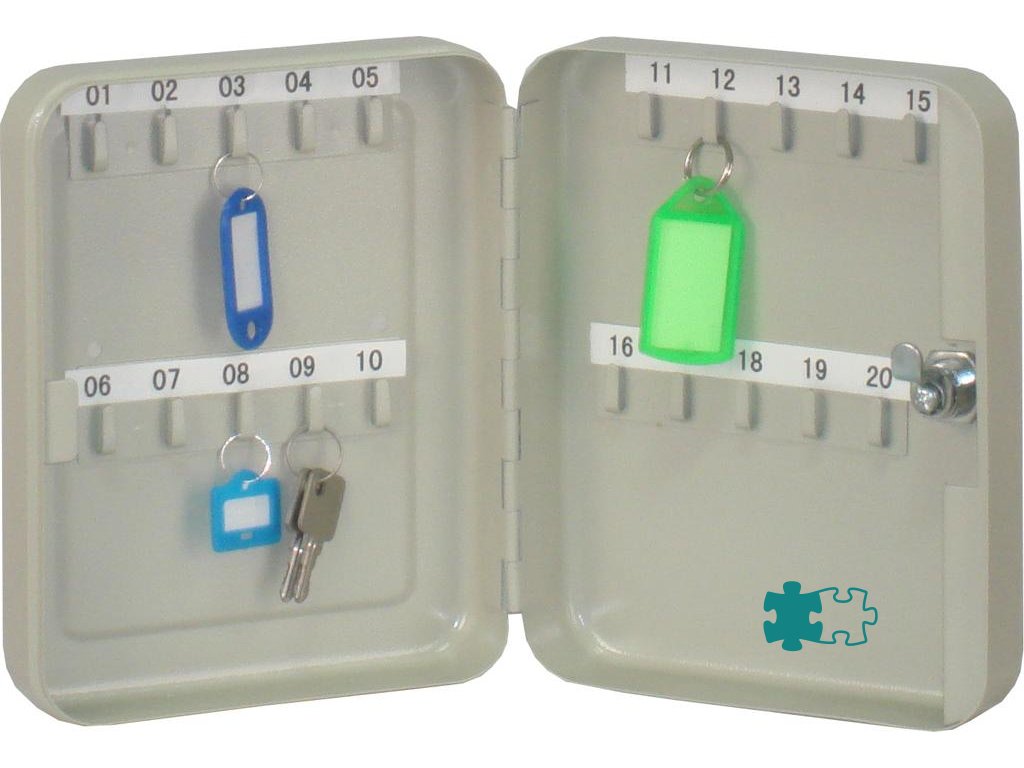 Uzamykateľná skrinka na 20 kľúčov, vyrobená z pevnej ocele. Súčasťou balenia sú 2 kľúče. Farba sivá. Rozmery 160 × 200 × 60 mm.Dodatočné parametre