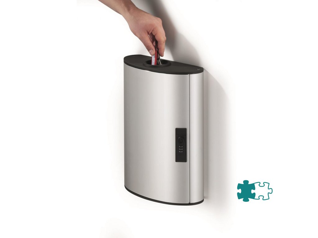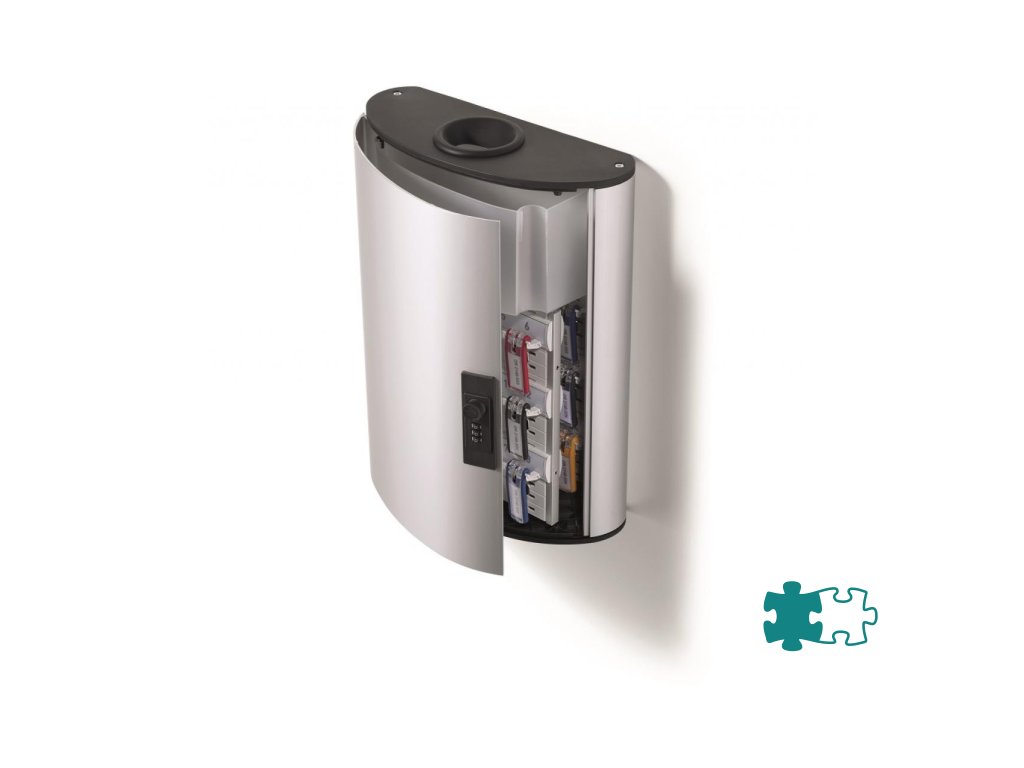Skrinka na kľúče so zámkom na číselný kód, s dvierkami, otvárajúcimi sa z dôvodu lepšej obsluhy v 180° uhle a vrchným otvorom na odovzdanie kľúča bez nutnosti otvorenia skrinky. Kapacita 54 kľúčov. Jednoduchá montáž na stenu. Súčasťou balenia je montážna sada a 6 menoviek na kľúče v rôznych farbách. Farba strieborná.Výška: 40 cm