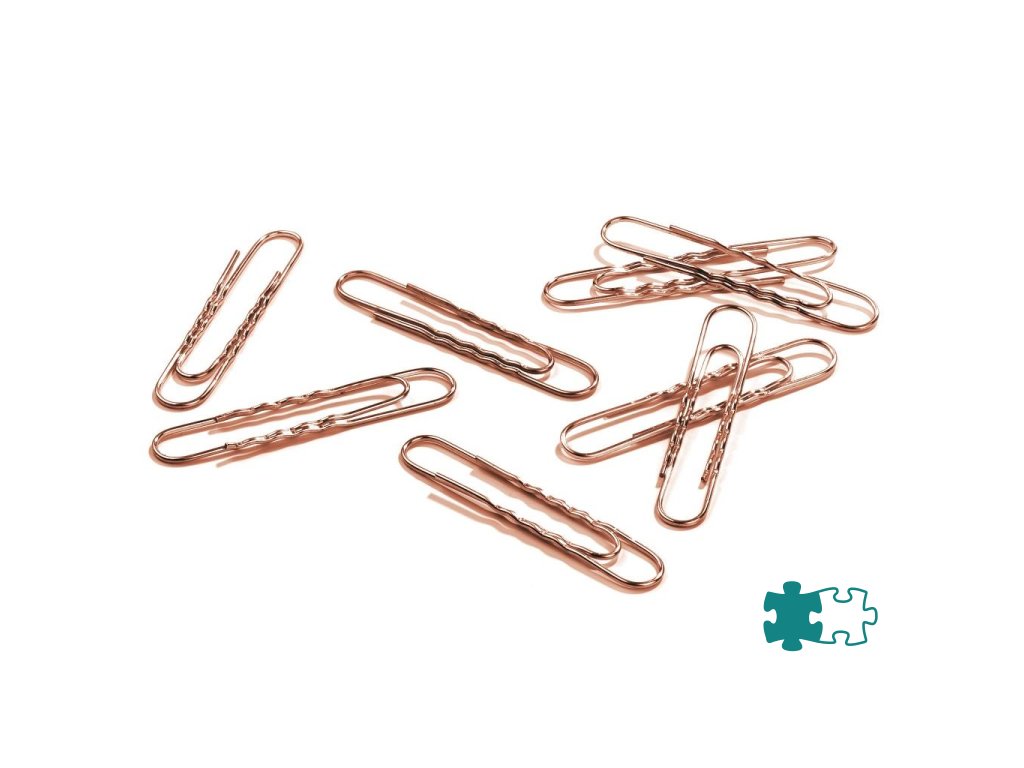 Veľké spisové spony v medenej úprave.Materiál: meď