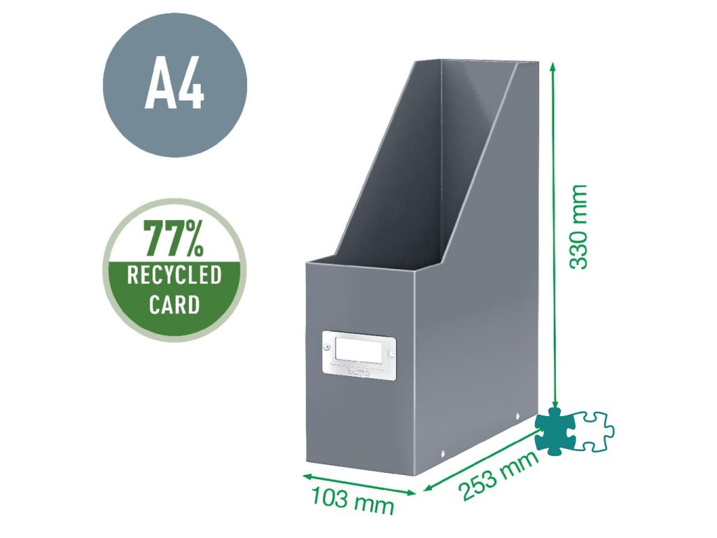 Stojan na časopisy s rámikom na popisovací štítok na prednej a zadnej strane. Skladací pre úsporu miesta, keď sa nepoužíva. Laminovaný povrch pre lepšiu a trvalejšiu ochranu. Jednoduché zloženie a vysoká stabilita vďaka vylepšenej konštrukcii. Perfektné na uloženie katalógov, brožúr, dosiek, časopisov a ich ľahkú dostupnosť. Dodajte svojmu pracovnému miestu alebo domácnosti farbu a skombinujte stojan s ostatnými kancelárskymi výrobkami z radu Leitz WOW. Rámik na štítok pre ľahké popisovanie. Vnútorné rozmery (ŠxVxH): 95 x 310 x 245 mm (predný pohľad). Farba červená.Dodatočné parametre