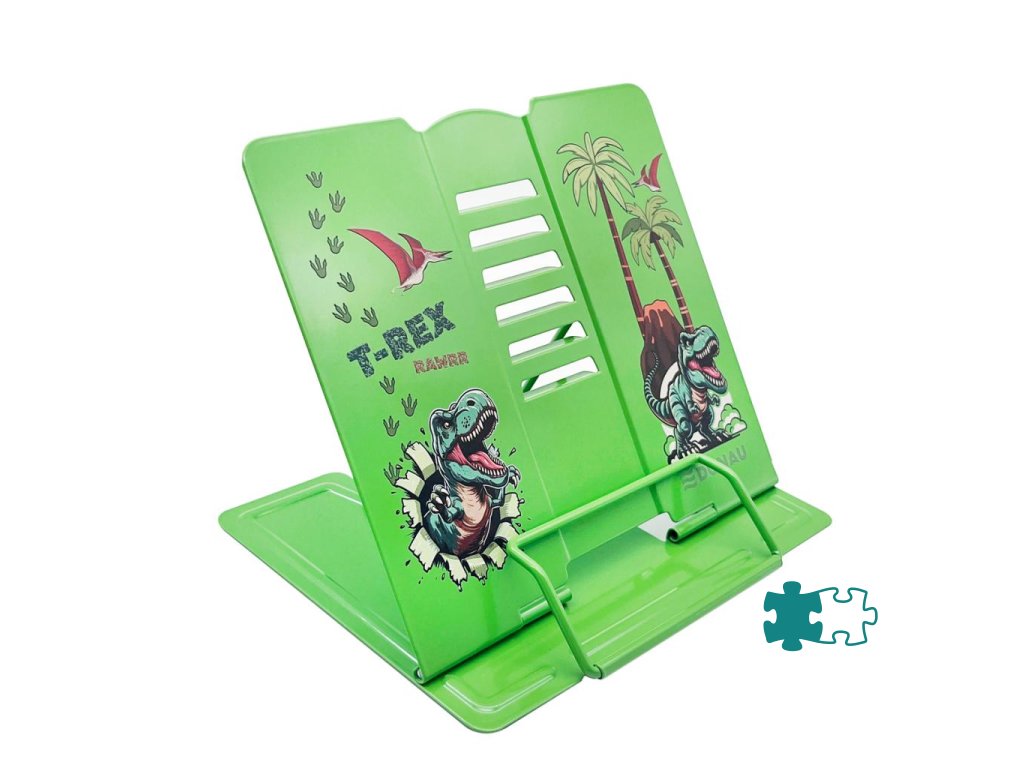 Kvalitný stojan na knihy, učebnice alebo tablet s atraktívnou potlačou Dino T-Rex. Vyrobený z odolného lakovaného kovu, ideálny aj pre ťažšie knihy. S protišmykovými úchytmi, nastaviteľná výška a uhol sklonu v 5 stupňoch. Keď sa nepoužíva, zloží sa úplne naplocho. Súčasťou je aj praktická zarážka na otvorenú stránku. Využitie nájde doma, v škole, v kuchyni, v kancelárii či ako stojan na noty. Rozmery: základňa: 21 × 16,5 cm, výška: 15,7 cm.Dodatočné parametre