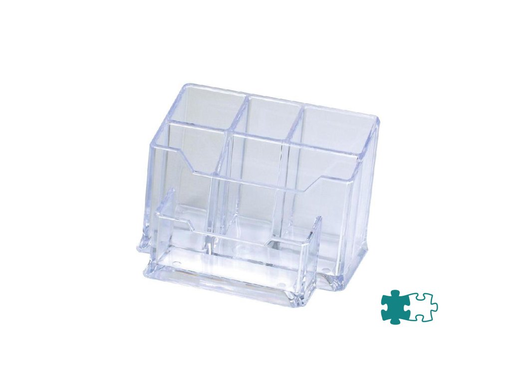 Priehľadný šesťdielny stojan na písacie potreby z tvrdeného akrylového plastu odolného voči prasknutiu. Rozmery 147 × 100 × 100 mm.Farba: priehľadná číra