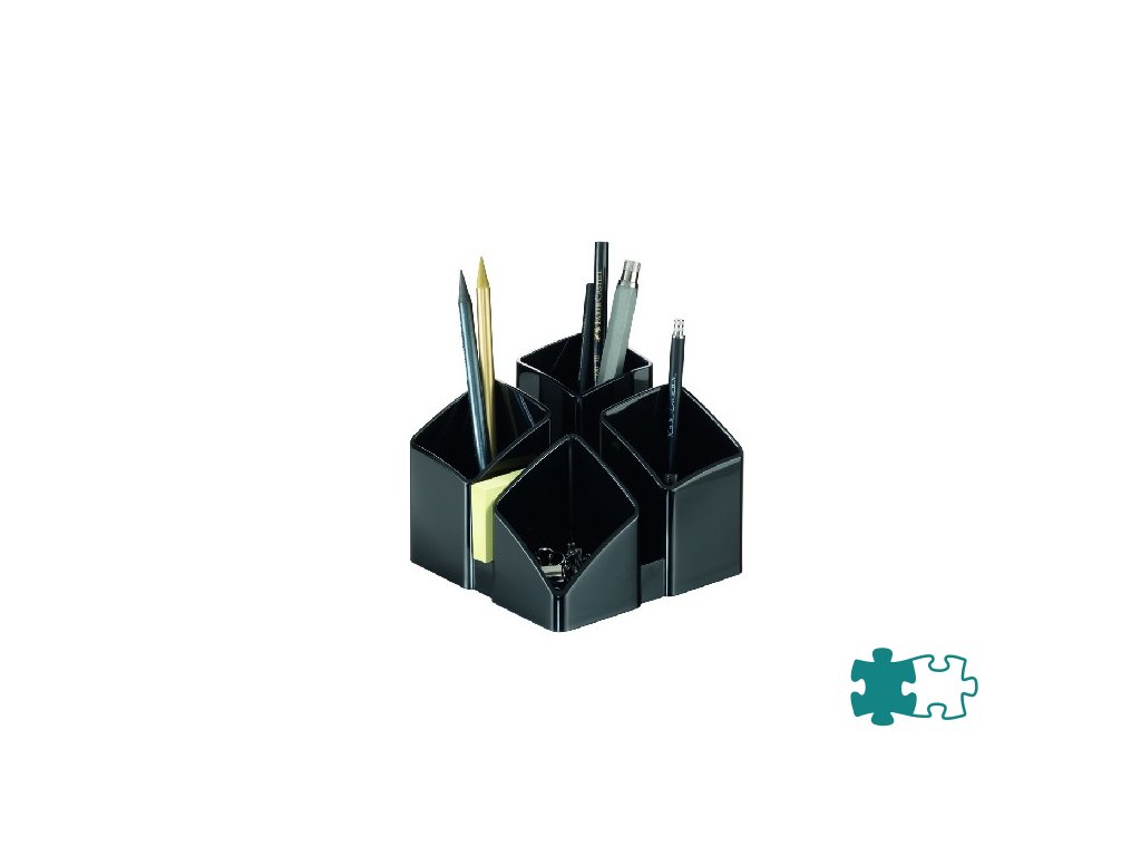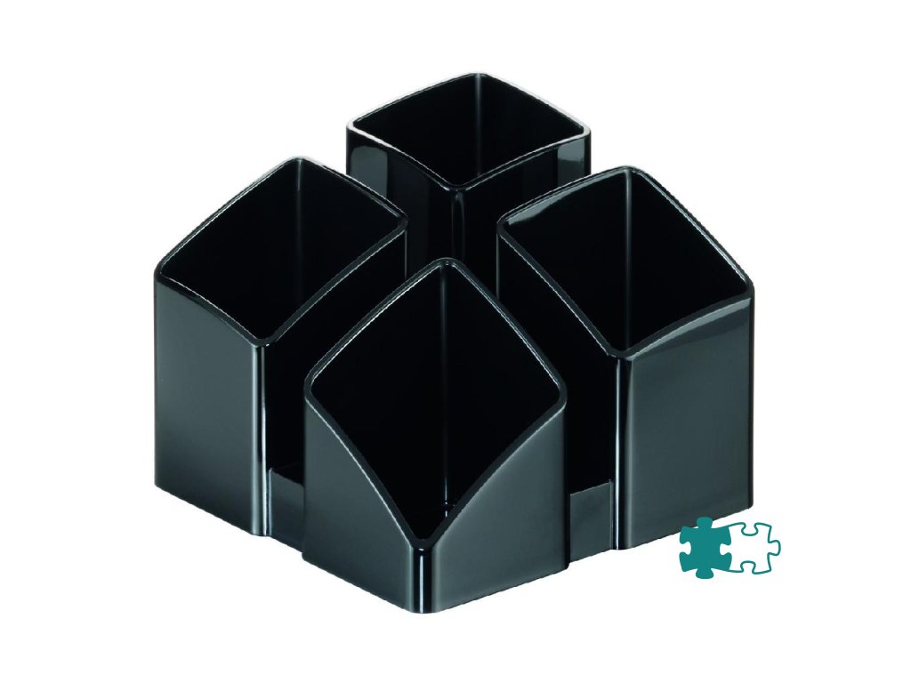 Stojan so 4 sekciami na písacie potreby a ďalšie kancelárske drobnosti. Spodná strana s protišmykovou úpravou. Materiál kvalitný plast vysokého lesku. Pri spojení 2 alebo 4 stojanov dosiahnete zaujímový moderný efekt. Rozmery 125 × 125 × 100 mm. Stojan dodávaný prázdny.Farba: čierna