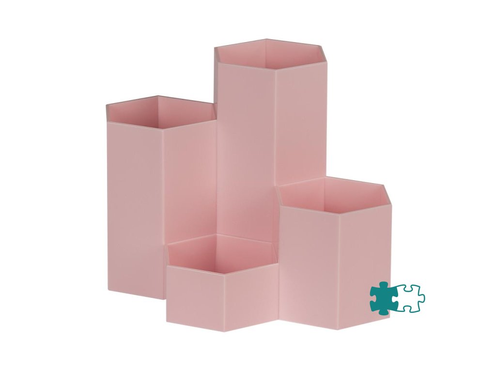 Stojan na perá so šesťuholníkovými trubicami je vyrobený z mimoriadne odolného a nárazuvzdorného polypropylénu. Vďaka tvaru včelieho plástu ho možno zoskupiť, aby sa ušetrilo miesto. 4 trubice, usporiadané v rôznych výškach, ponúkajú voľný priestor na pravítka, štetce, nožnice, perá a samozrejme aj na menšie predmety na stole, ako sú strúhadlá a gumy.Dodatočné parametre