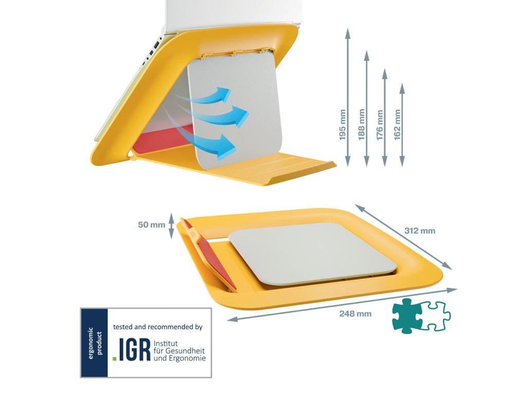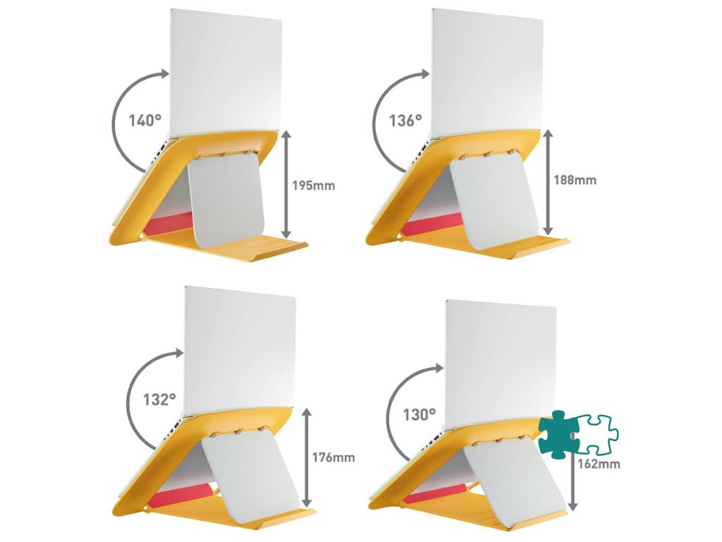 Ergonomicky navrhnutý stojan na notebook pre maximálne pohodlie pri práci. Ideálny na prácu posediačky alebo postojačky pri výškovo nastaviteľnom stole, čo ešte viac zlepšuje celkové zdravie a pohodu Nastavte výšku tak, aby bola obrazovka notebooku v ideálnej pozícii na sledovanie Stojan na notebook udržiava batériu a ostatné komponenty v perfektnom stave vďaka chladeniu prúdením vzduchu Rýchle a jednoduché individuálne prispôsobenie stojana na notebook, štyri rôzne výšky na výber Vďaka kompaktnému dizajnu a podstavcu je ideálnym doplnkom každého pracovného stola Keď ho nepoužívate, jednoducho ho zložíte Gumové prvky a integrovaný držiak poskytujú bezpečné a stabilné uchytenie vášho notebooku, aby zostal pevne na svojom mieste Vhodné pre notebooky od 13` do 17`. Tento výrobok by sa mal používať s externou klávesnicou a myšou (predáva sa samostatne) Kolekcia Leitz Cosy Ergo spája štýl s prvotriednou kvalitou na vytvorenie zdravého a aktívneho pracovného prostredia. Farba žltá.Dodatočné parametre