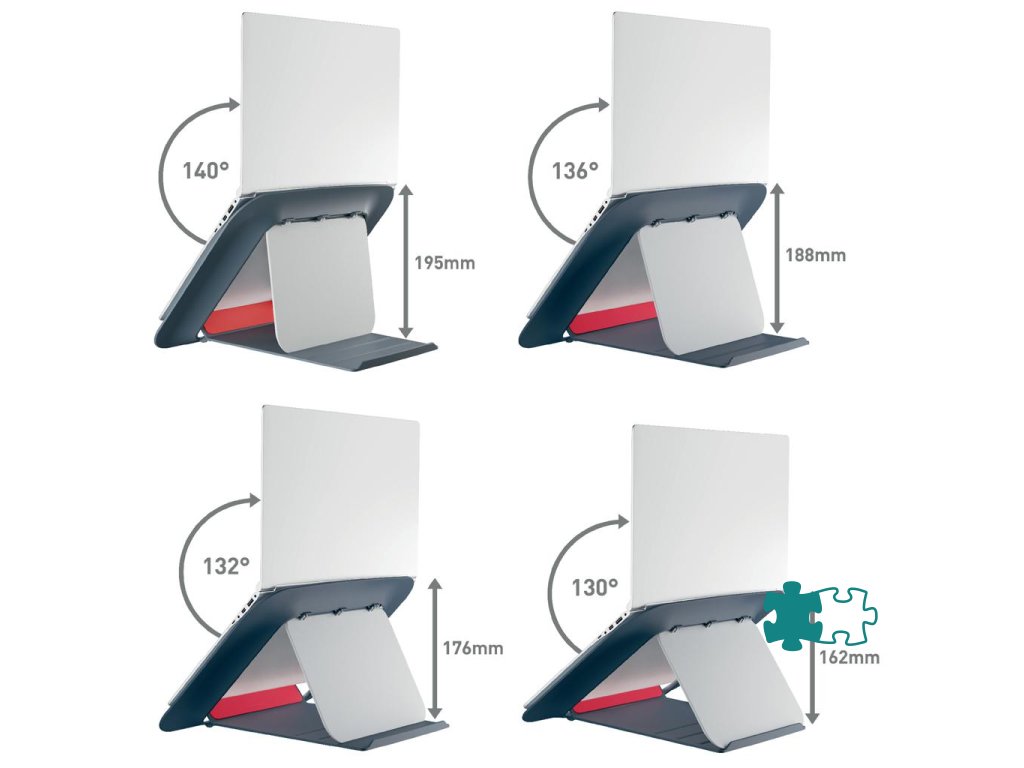 Ergonomicky navrhnutý stojan na notebook pre maximálne pohodlie pri práci. Ideálny na prácu posediačky alebo postojačky pri výškovo nastaviteľnom stole, čo ešte viac zlepšuje celkové zdravie a pohodu Nastavte výšku tak, aby bola obrazovka notebooku v ideálnej pozícii na sledovanie Stojan na notebook udržiava batériu a ostatné komponenty v perfektnom stave vďaka chladeniu prúdením vzduchu Rýchle a jednoduché individuálne prispôsobenie stojana na notebook, štyri rôzne výšky na výber Vďaka kompaktnému dizajnu a podstavcu je ideálnym doplnkom každého pracovného stola Keď ho nepoužívate, jednoducho ho zložíte Gumové prvky a integrovaný držiak poskytujú bezpečné a stabilné uchytenie vášho notebooku, aby zostal pevne na svojom mieste Vhodné pre notebooky od 13` do 17`. Tento výrobok by sa mal používať s externou klávesnicou a myšou (predáva sa samostatne) Kolekcia Leitz Cosy Ergo spája štýl s prvotriednou kvalitou na vytvorenie zdravého a aktívneho pracovného prostredia. Farba sivá.Dodatočné parametre