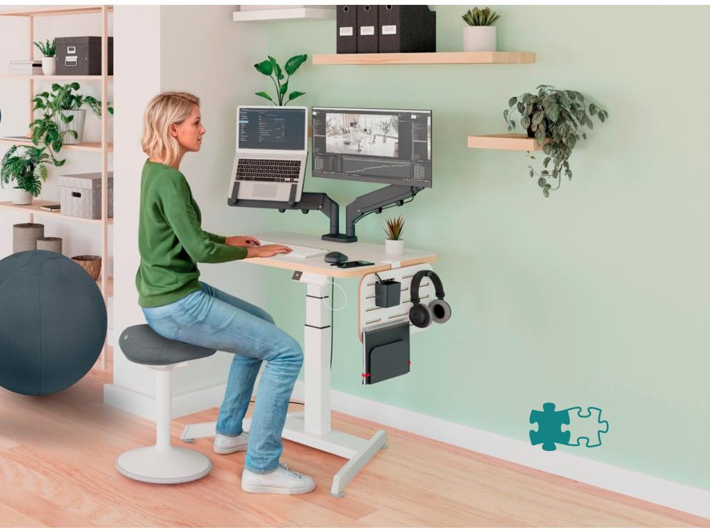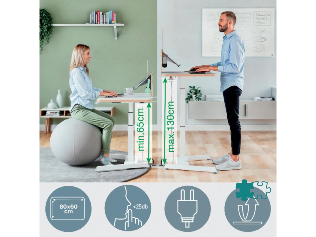SEDIEŤ - ŠTÁT - HÝBAŤ SA. Či už sa usilujete o zdravší pracovný režim alebo hľadáte ergonomické riešenie, ako sa vyhnúť bolestiam, naše priestorovo úsporné stoly sú navrhnuté tak, aby pozdvihli váš pracovný priestor do nových výšin.Elektrický stôl na sedenie/státie s kompaktnou stolnou doskou (80 x 60 cm)