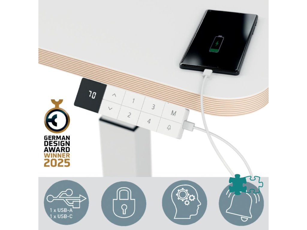 Jednoduchá manipulácia vďaka slúchadlu so 4 pamäťovými funkciami, pripomenutie státia, antikolizná a detská poistka, ochrana proti prehriatiu, 5V USB-C a USB port, obrazovka s výškou displeja)