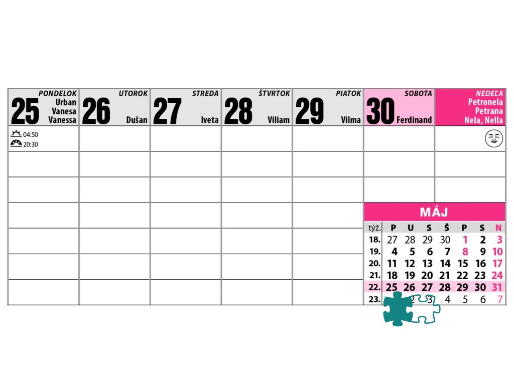 Tento týždenný stĺpcový kalendár ocenia najmä seniori a ľudia so zhoršeným zrakom. Veľké, ľahko čitateľné písmo zaručuje pohodlné používanie bez námahy. Obsahuje tabuľku prázdnin, slovenský menný kalendár a priestor na poznámky. Ideálny pomocník do domácnosti alebo kancelárie.Formát: 297 x 138