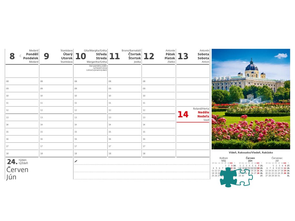 Formát kalendára: 30,1 x 15 cmKalendárium: slovenské týždenné stĺpcové + Aj + NJ