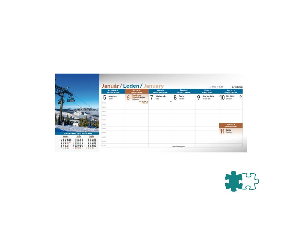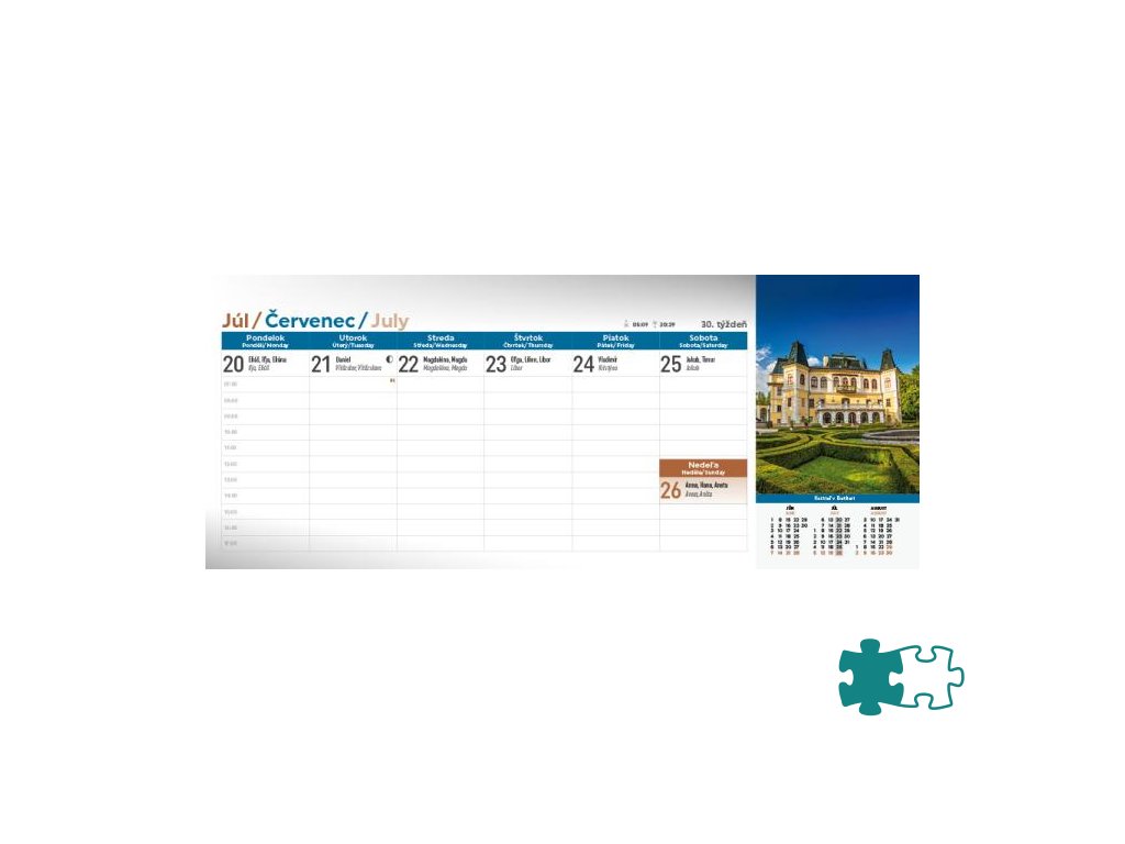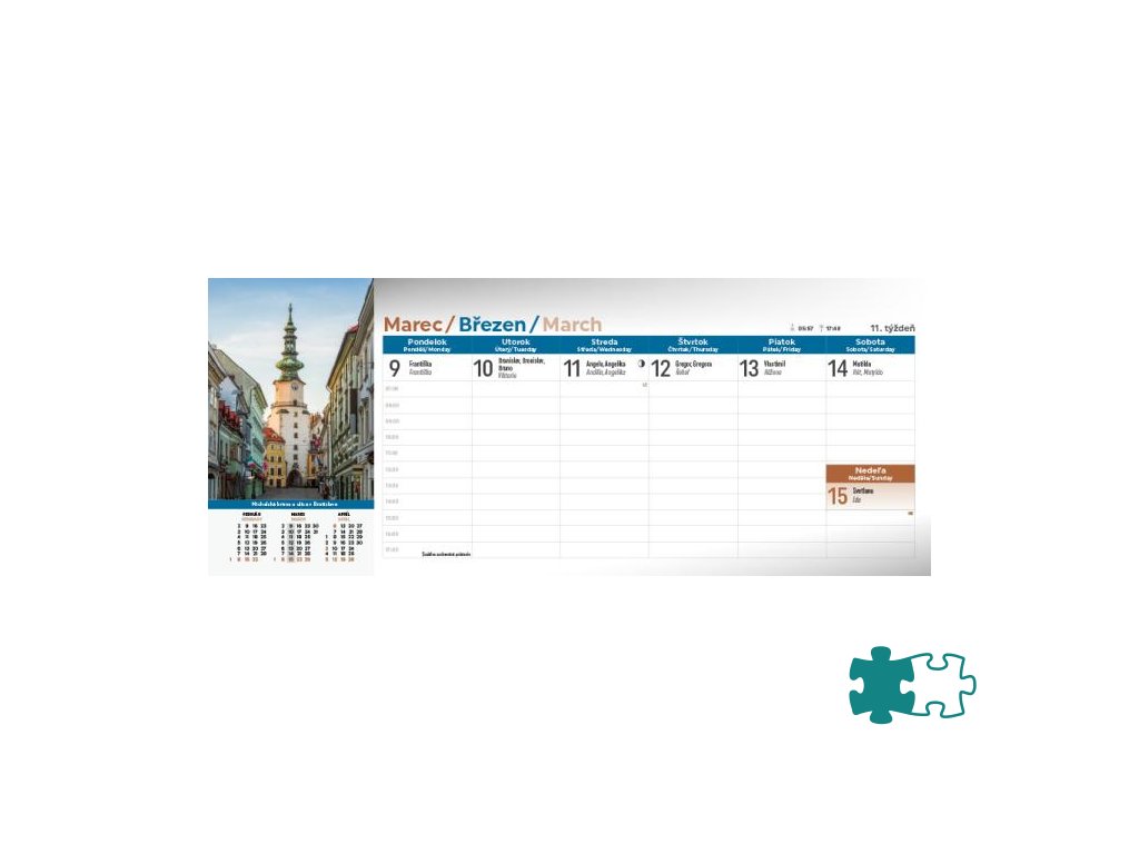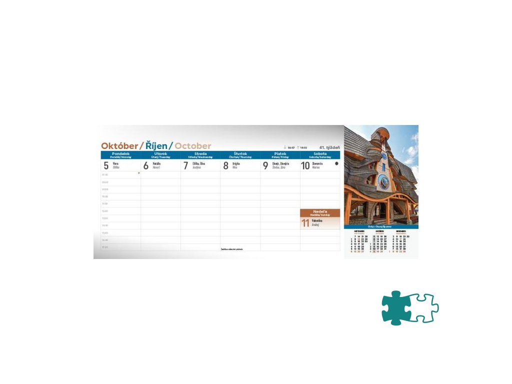Spoznajte krásy Slovenska prostredníctvom stolového kalendára Slovensko. Týždňový stĺpcový kalendár s hodinovým delením, daňovými pripomienkami, fázami Mesiaca, východmi a západmi Slnka, štátnymi sviatkami všetkých krajín EÚ, školskými prázdninami, slovenskými a českými menami (plus netradičné mená).Formát: 300 × 120 mm