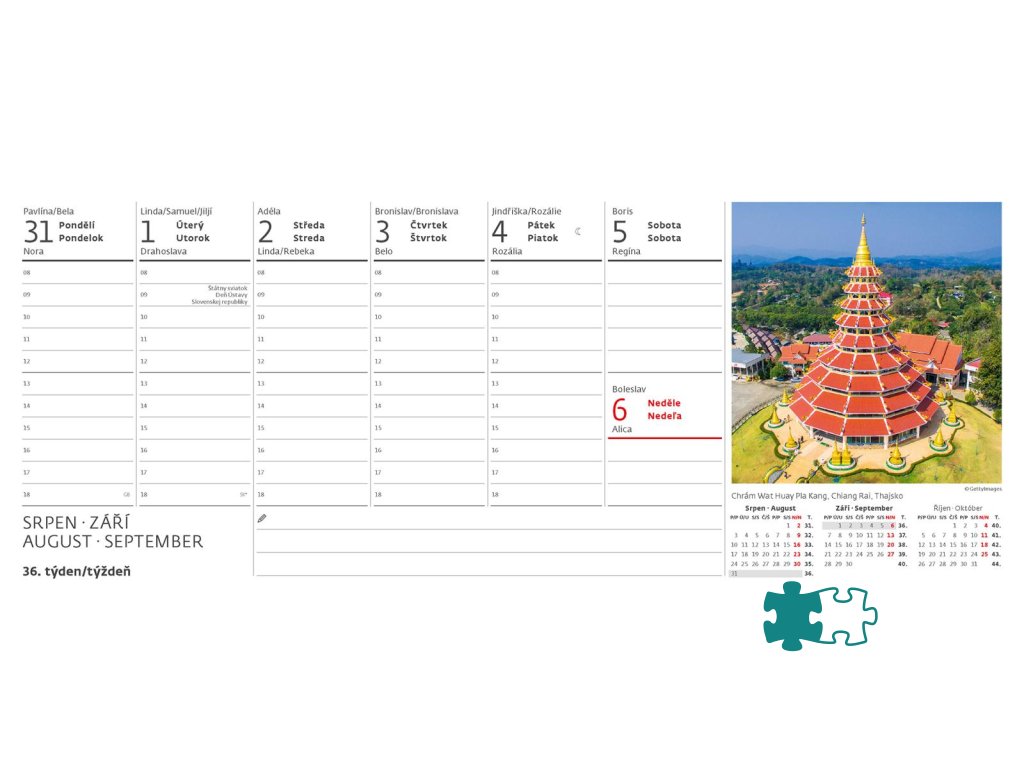 Formát kalendára: 32,1 x 13,4 cmKalendárium: české/slovenské týždenné stĺpcové