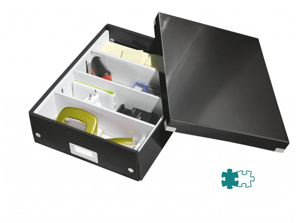 Štýlová skladacia krabica s vekom a s rámčekom na štítok. Na usporiadanie nabíjačiek, káblov a ďalšieho vybavenia kancelárie. Veľkosť M. Na prvý pohľad vidíte, čo sa vojde dovnútra! Výška krabice bola navrhnutá tak, aby vám poskytla dostatok priestoru na uloženie príslušenstva a zároveň zabránila skladaniu vecí na seba. Na vylepšenie usporiadania obsahu krabice použite priložený vnútorný systém priehradiek. Môžete rozdeliť krabicu na 2 alebo 3 časti a zabrániť tak miešaniu káblov alebo fotiek. Pevný kartón potiahnutý polaminovaným papierom. Farba čierna.Inteligentná skladacia konštrukcia: rýchle a jednoduché zloženie bez nutnosti použitia skrutiek a možnosť opätovného rozloženia na úsporu miesta, keď krabicu práve nepotrebujete
