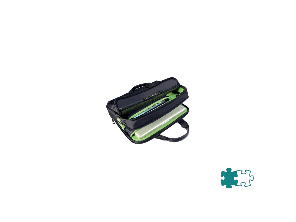 Kvalitná, ľahká a kompaktná taška s dvoma hlavnými a jednou menšou prednou kapsou. Výrazný a elegantný dizajn dopĺňajú kvalitné zipsy a štýlové matne kovové pracky. Čierny povrch s kontrastným zeleným vnútrajškom, aby sa predmety ľahšie hľadali. Taška ponúka miesto na všetky vaše mobilné zariadenia, 13,3` notebook a dokumenty do formátu A4. Je možné pohodlne nosiť vďaka vystlaným rukovätiam z pravej kože alebo nastaviteľnému ramennému popruhu, prípadne upevniť na držadlo pojazdného kufra. Farba čierna/zelená.Dodatočné parametre