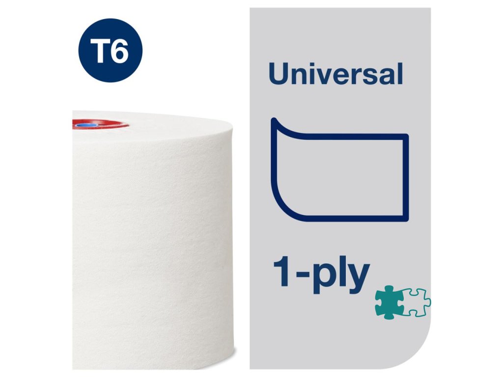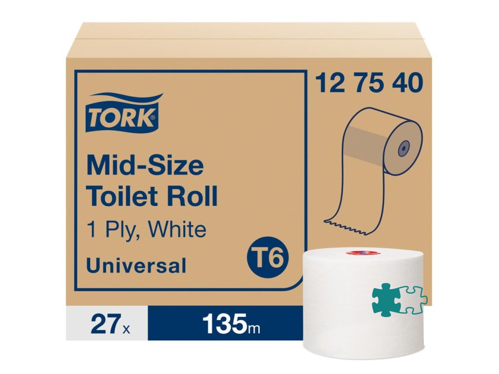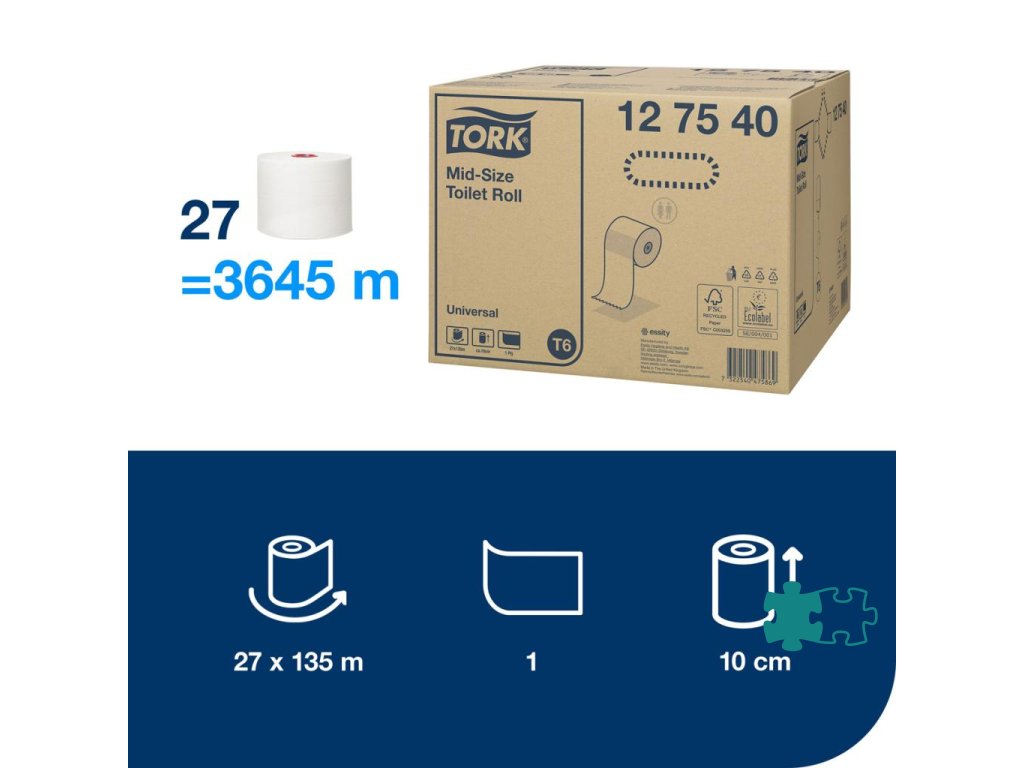 Toaletný papier v kompaktnej roli Tork je určený pre zásobníky systému T6. Obsahuje 135 m dvojvrstvového kvalitného toaletného papiera. Každá rola je chránená hygienickým obalom V balení 27 ks roliek. Ľudia požadujú toalety s vysokou úrovňou komfortu a spoľahlivosti všade tam, kde pracujú, bavia sa či nakupujú. Ponuka toaletného papiera Tork zahrňuje celú radu papiera v rôznych formátoch a veľkostiach, od jumbo rolí pre tie najfrekventovanejšie miesta až po konvenčný toaletný papier pre všetky typy toaliet. Vhodné pre veľmi frekventované miesta. Dobrá kvalita. Systém: T6 Úžitok: Toaletný papier kompaktný kotúč TORK Unniversal určený pre zásobníky systému T6 Farba: biela Materiál: recykl Dĺžka: 135 m Priemer: 132 mm Počet vrstiev: 1 Váha: 9,24 kgDodatočné parametre