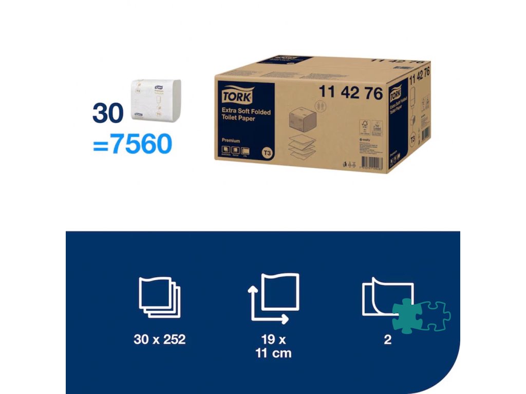 Systém Tork Folded skladaný toaletný papier ponúka hygienické dávkovanie po útržkoch, čo znižuje odpad a náklady na údržbu. Tork Folded extra jemný toaletný papier Premium ponúka vynikajúci vzhľad, pocit a výborný výkon. Dávkovanie po útržkoch znižuje spotrebu a zlepšuje úroveň hygieny. Luxusný, extra mäkký hygienický papier s vysokým jasom zanecháva dlhotrvajúci dojem. Jednoduché dopĺňanie: menšia údržba.Dĺžka rozloženého ústrižku: 19 cm