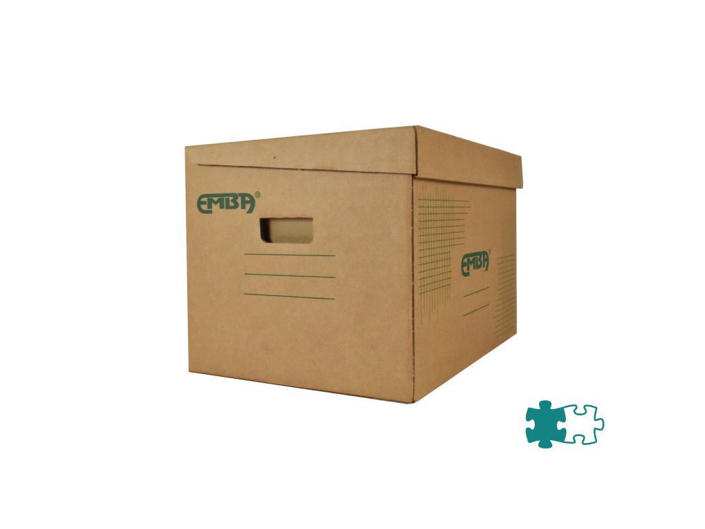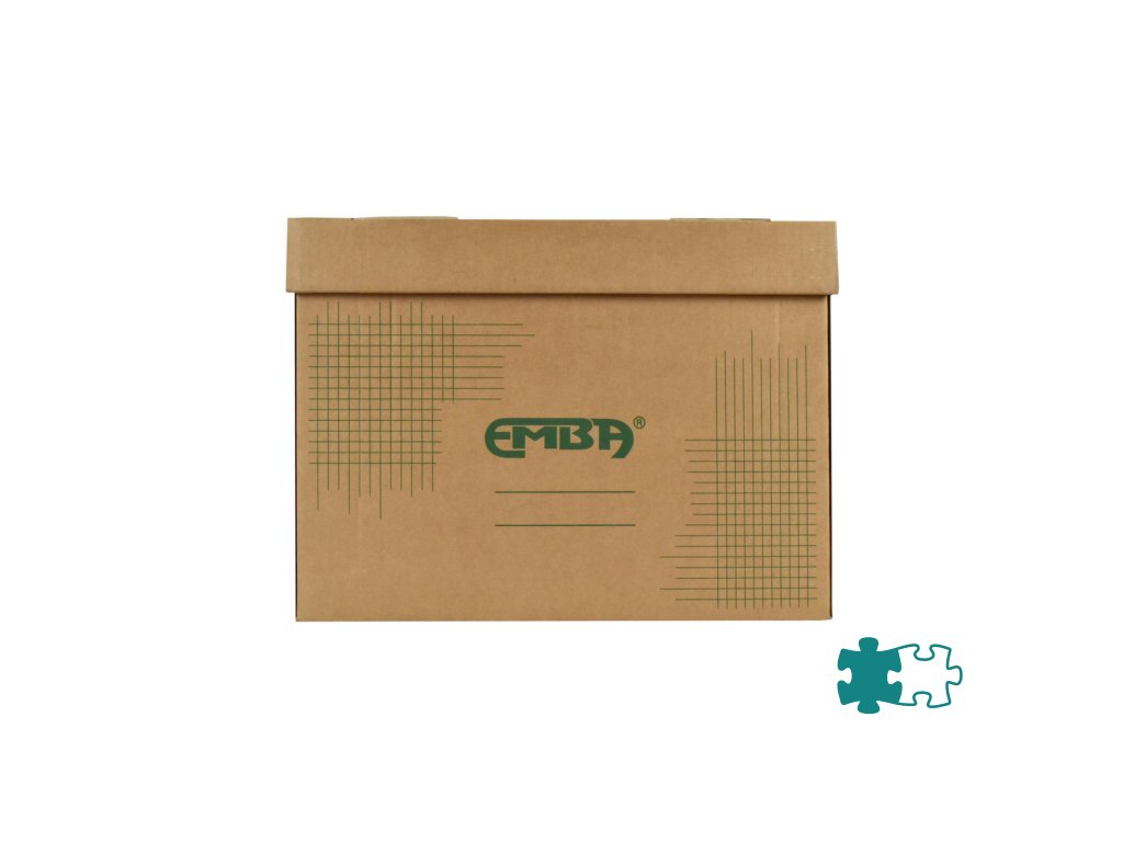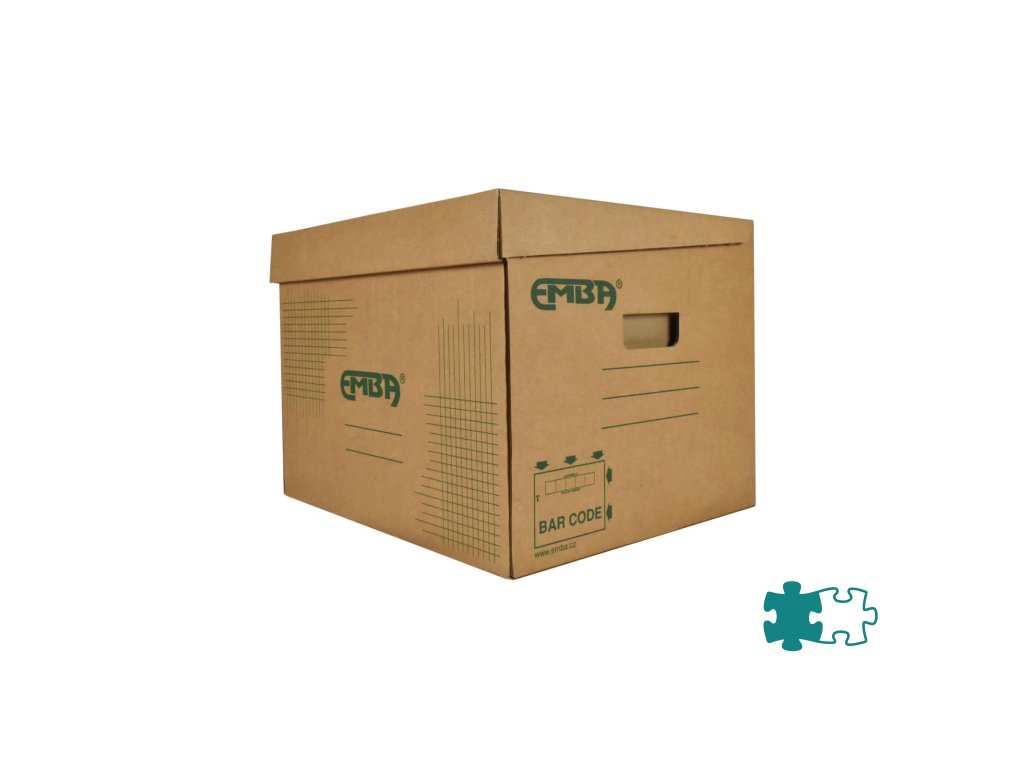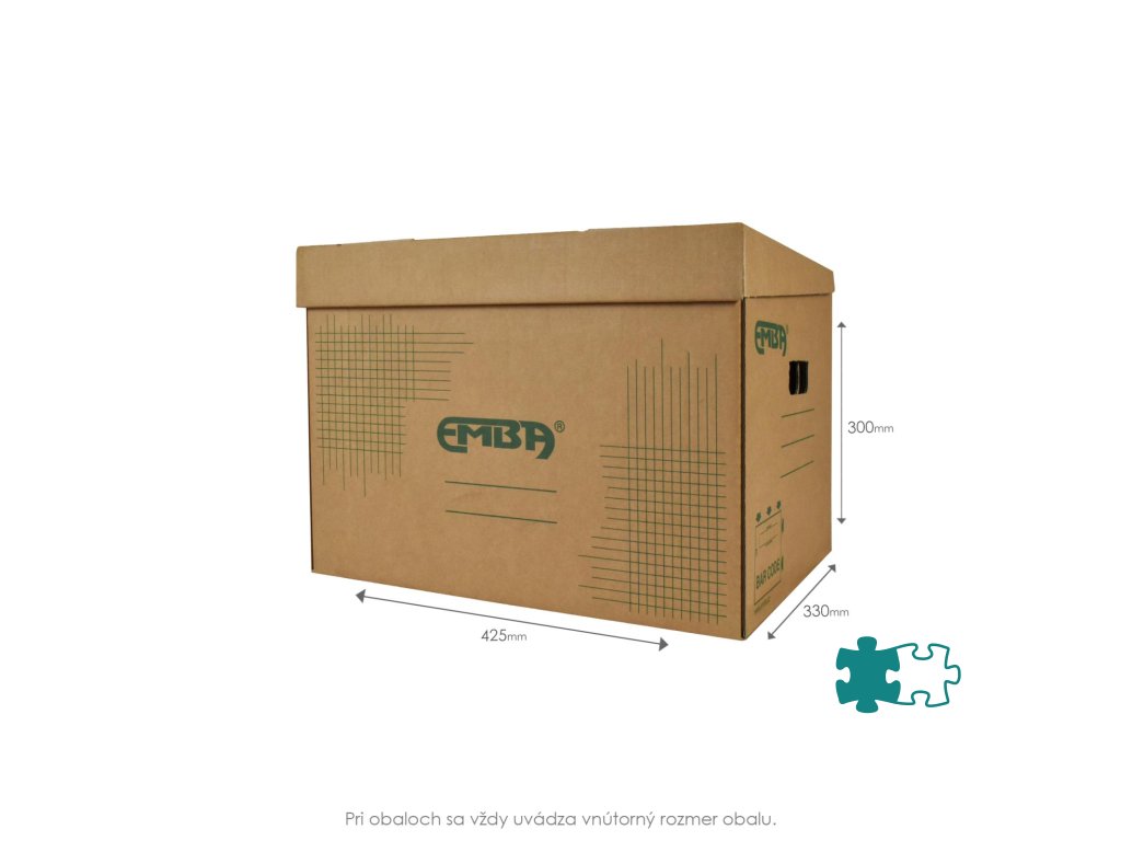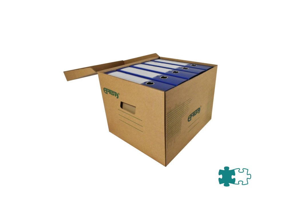 Škatuľa z hnedej vlnitej lepenky so sklápacím vekom a zelenou potlačou na ukladanie a archiváciu 5 zakladačov šírky 8 cm alebo archívnych boxov I/-75 mm. Rozmery (š x v x d) 425 x 330 x 300 mm. Nosnosť 100 Kg.Dodatočné parametre