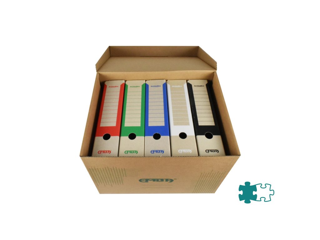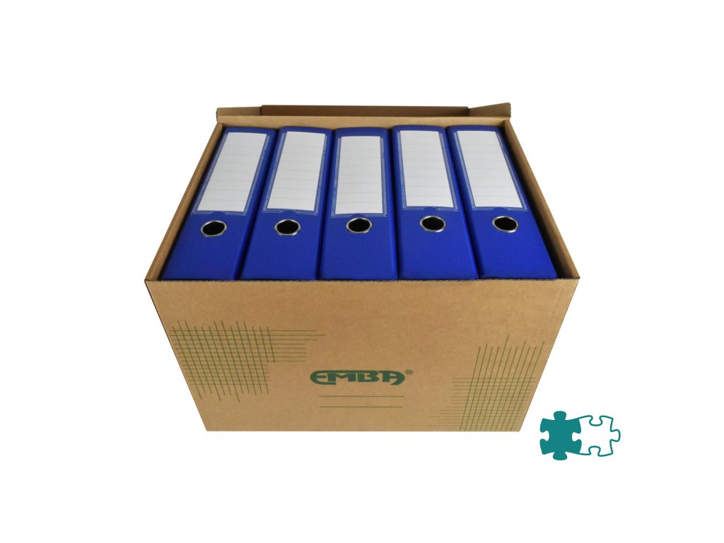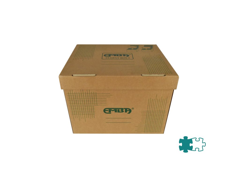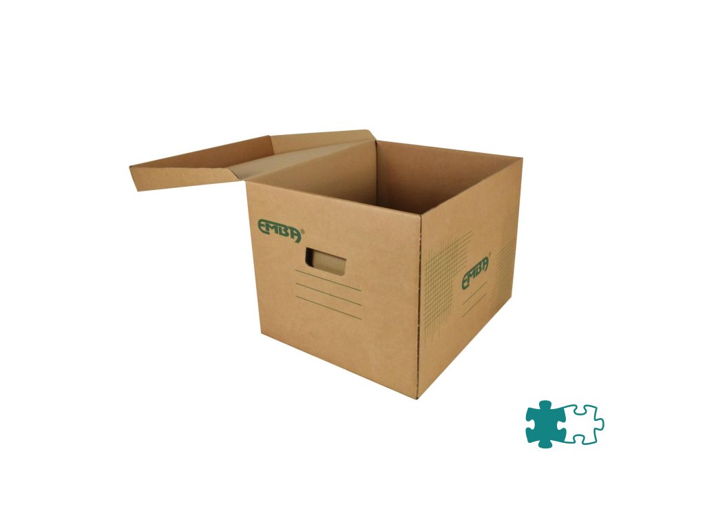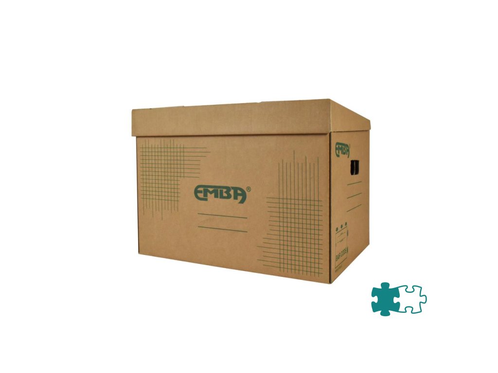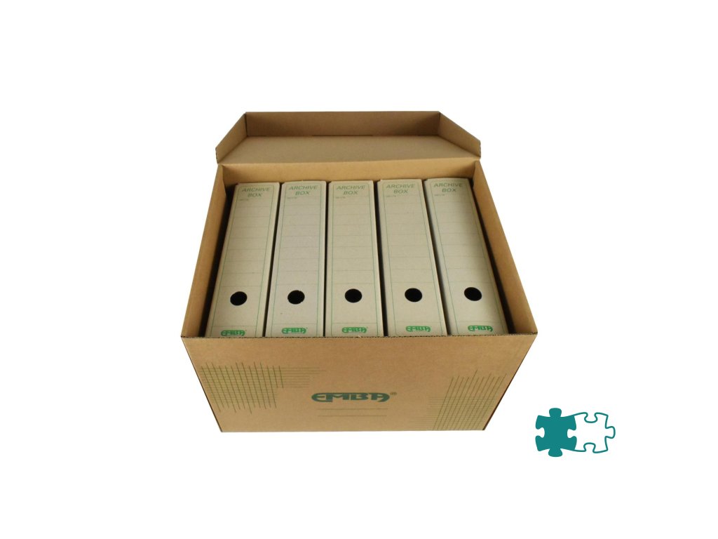 Škatuľa z hnedej vlnitej lepenky so sklápacím vekom a zelenou potlačou na ukladanie a archiváciu 5 zakladačov šírky 8 cm alebo archívnych boxov I/-75 mm. Rozmery (š x v x d) 425 x 330 x 300 mm. Nosnosť 100 Kg.Dodatočné parametre
