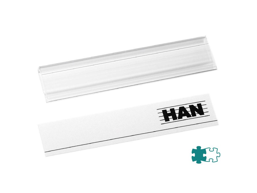 Balenie 10 ks priehľadných čírych klipov z plastu a 10 papierových etikiet na označovanie odkladačov a zásuvkových boxov značky HAN a závesných obalov.Farba: priehľadná číra