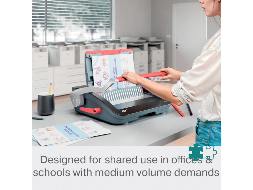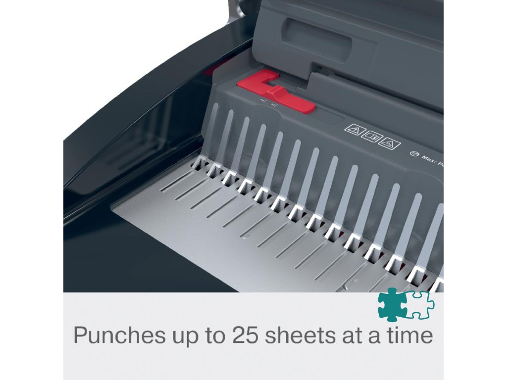 • spoľahlivý a kompaktný ručný viazač s plastovými chrbtami, navrhnutý na zdieľané použitie v kancelárskom a školskom prostredí s bežnými nárokmi na objem väzby• presekne až 25 listov papiera s gramážou 80 g/m² formátu A5/A4 naraz a efektívne zviaže až 390 listov naraz pomocou 45 mm chrbtov