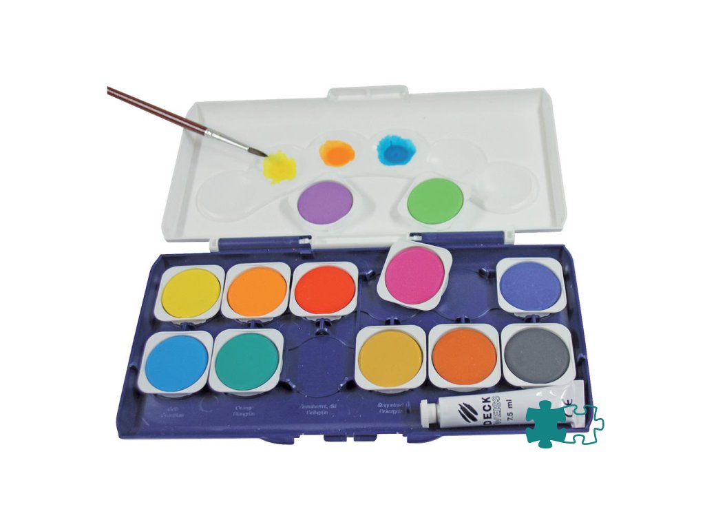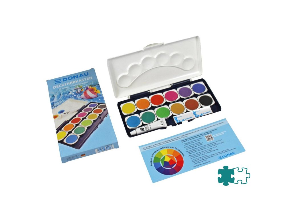Vodové farby Donau, 12 farieb, vrátane nepriehľadnej bielej. Vyberateľné misky, paleta na miešanie farieb.Dodatočné parametre